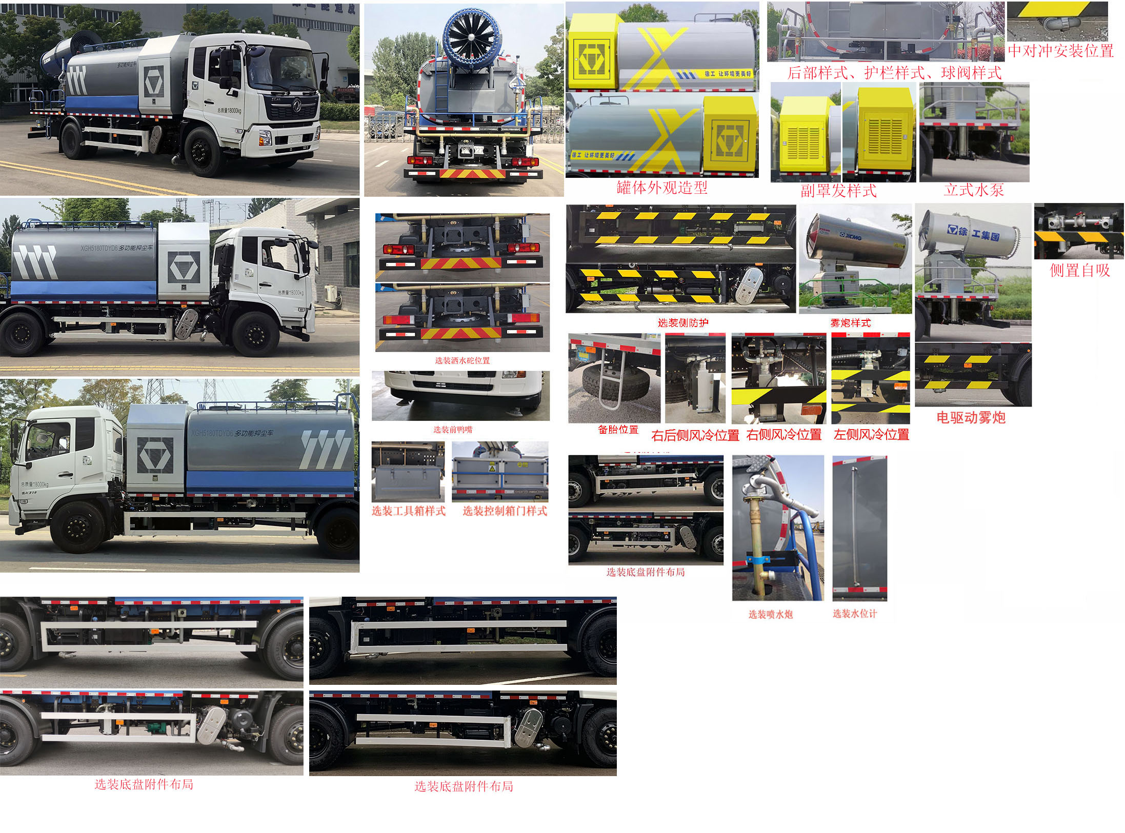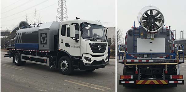 该车专用装置为喷雾系统装置、储液箱、气控系统,主要用于道路、广场或固定场所除霾降尘等作业.罐体长轴(mm)×短轴(mm)×长度(mm):2440×1750×3235,罐体有效容积8立方米;仅选用5300mm和5000mm轴距.装Ⅰ型雾炮时:车辆的前悬(mm)/轴距(mm)/后伸(mm)/长度(mm)/高度(mm)/整备质量(kg)对应关系为:1:1400/5300/750/10050/3640/10980,2:1430/5300/720/10050/3640/10980,3:1400/5000/750/9750/3640/10750,4:1430/5000/720/9750/3640/10550,5:1400/5000/1050/10500/3540/10660,6: 1430/5000/1020/10050/3540/10510;装Ⅱ型雾炮时:车辆的前悬(mm)/轴距(mm)/后伸(mm)/长度(mm)/高度(mm)/整备质量(kg)对对应关系为:1:1400/5300/635/9935/3700/10980,2:1430/5300/605/9935/3700/10980,3:1400/5000/635/9635/3700/10750,4:1430/5000/605/9635/3700/10550,5:1400/5000/935/9635/3600/10660,6:1430/5000/905/9935/3600/10510;装Ⅲ型雾炮时:车辆的前悬(mm)/轴距(mm)/后伸(mm)/长度(mm)/高度(mm)/整备质量(kg)对应关系为:1:1400/5300/170/9470/3700/10750,2:1430/5300/140/9470/3700/10750,3:1400/5000/170/9170/3700/10510,4:1430/5000/140/9170/3700/10360,5:1400/5000/470/9470/3600/10510,6:1430/5000/440/9470/3600/10360.选装上装外观,后平台护栏,备胎位置,风冷器位置,前鸭嘴和中对冲位置,可换装电驱动雾炮.侧防护材料为铝合金,选装Q235B,后防护材料为Q345B,均与车辆采用螺栓连接;后防护截面尺寸为160mm×80mm,选装后防护截面尺寸为180mm×60mm,离地高度为455mm.ABS型号/生产厂家:3631010-C2000/东科克诺尔商用车制动系统(十堰)有限公司,ABS 8/东科克诺尔商用车制动系统(十堰)有限公司,4460046450/威伯科汽车控制系统(中国)有限公司,J ABS/焦作博瑞克控制技术有限公司.随底盘选装高度不同的驾驶室;选装前雾灯;选装驾驶室顶部装饰灯;选装驾驶室前面罩;选装前保险杠及前部灯具,选装前下视镜,选装不同结构的车门裙板,选装驾驶室卧铺侧窗装饰板.选装后视镜;选装后部灯具;驾驶室前脸扰流罩为选装件;选装后视镜;驾驶室卧铺侧窗选装装饰板;选装油箱安装位置,选装踏步结构;随底盘选装限速装置,限速89km/h. |