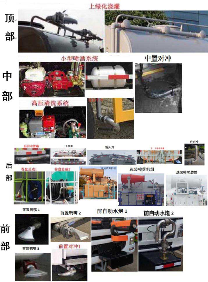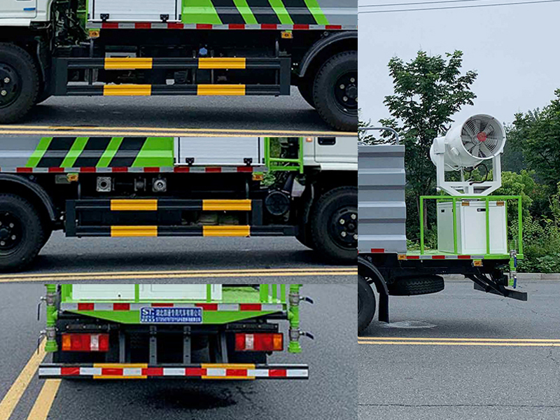 | 其他 | 该车专用装置为抑尘雾炮,用于城市或建筑工地的降尘作用;侧、后防护材质均为Q235,连接方式均采用螺接连接,后部防护装置断面尺寸(宽×高)50×100(mm),后部防护离地高度:425mm;随底盘选装驾驶室,选装轮辋外观;ABS系统型号:VIE ABS-II,ABS系统生产厂家:浙江万安科技股份有限公司;选装箱体外观,选装后雾炮装置型号,选装后高位花洒,选装方圆管道箱,选装后雾炮装置,选装后弧形喷雾.选装LED箭头指示灯,选装后平台式样,选装喷枪安装位置,选装喷洒系统,中置对冲,箭头灯,前置鸭嘴,前自动水炮,裙边炮筒,罐顶平台. | ||