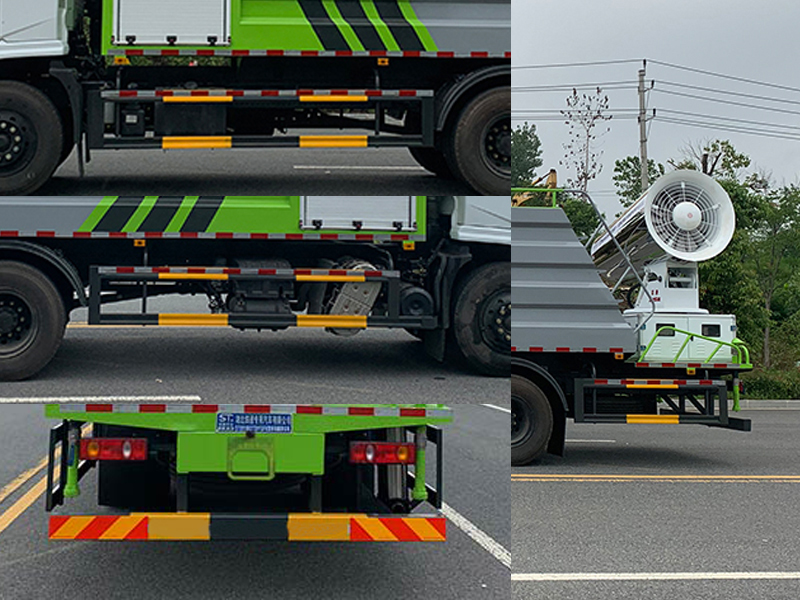 | 其他 | 1.该车专用装置为抑尘雾炮,用于城市或建筑工地的降尘作用;整车长/轴距/前悬/后悬/后伸(mm)对应关系为:10060/4500/1440/2920/1200,9660/4500/1440/2920/800,8860/4500/1440/2920/0,7950/3950/1440/2560/0;仅选用3950,4500mm轴距;2.侧、后防护材质均为Q235,连接方式:左右侧面防护及后部防护均采用螺栓连接,后部防护装置断面尺寸(宽×高)60×140(mm),后部防护离地高度:400mm;3.随底盘选装驾驶室;ABS型号/生产厂家:3631010-C2000/东科克诺尔商用车制动系统(十堰)有限公司,ABS-E 4S/4M/生产厂为威伯科汽车控制系统(中国)有限公司;选装箱体外观,选装发动机舱样式,选装雾炮样式,选装底盘布局,选装副驾侧管网,选装铁制挡泥板. | ||