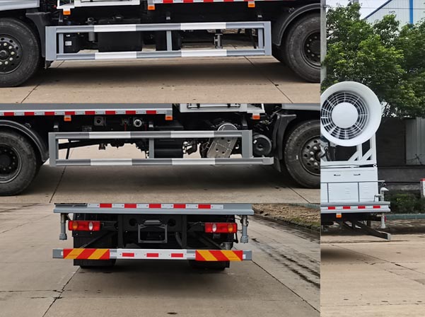 | 其他 | 随底盘选装驾驶室, 侧防护材料为Q235,螺栓连接;后防护材料为Q235,焊接连接,截面尺寸为:120×60(mm),离地高度为:450(mm)。ABS型号/生产厂家:3631010-C2000/东科克诺尔商用车制动系统(十堰)有限公司,ABS 8/东科克诺尔商用车制动系统(十堰)有限公司, 4460046450/威伯科汽车控制系统(中国)有限公司,J ABS/焦作博瑞克控制技术有限公司;该车用途为抑尘降霾,主要装置为水罐及喷雾装置。采用4500mm,4700mm轴距底盘,罐体有效容积:8.84立方米,罐体尺寸:3200×2400×1600.随底盘选装限速装置,限速89km/h. | ||