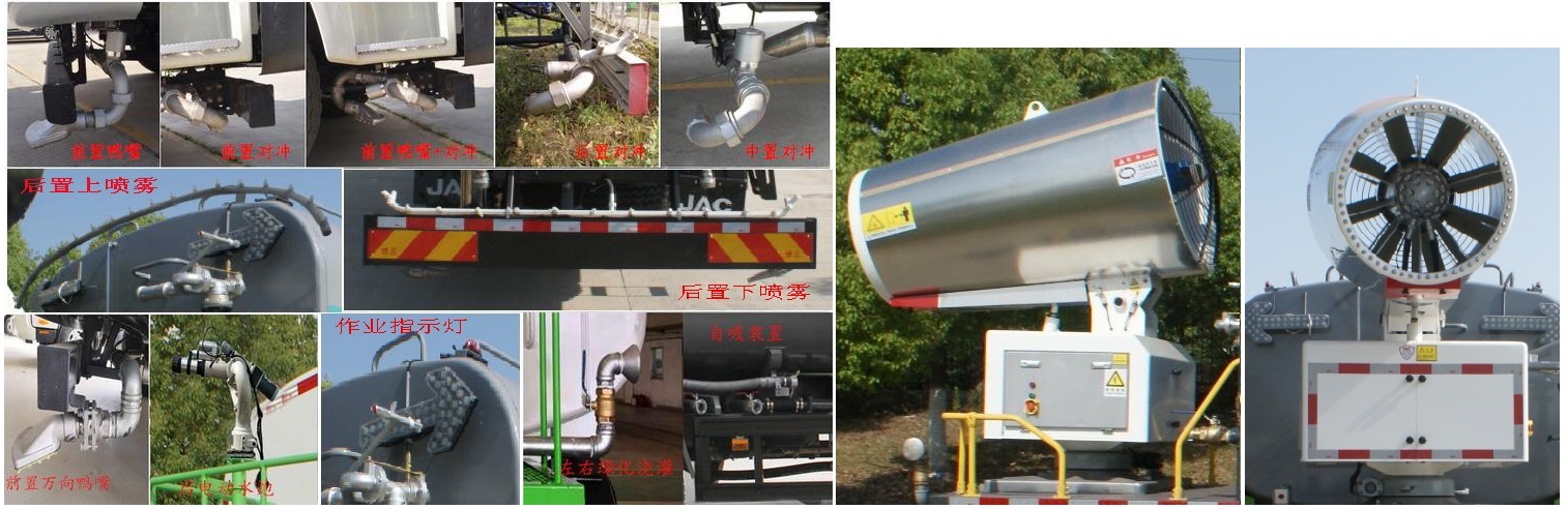 | 其他 | 该车装备有雾炮、水泵、喷嘴等装置,用于喷洒水、园林绿化、喷雾降尘等作业;随底盘选装前下视镜、后视镜;选装雾炮;选装鸭嘴、对冲喷头、后部上下喷雾装置、后自动水炮、后部作业指示灯、绿化浇灌、自吸等装置;侧后防护材料/连接方式:Q235/螺栓连接,后下部防护装置断面尺寸(高×宽)/离地高度(mm):240×60/450;ABS控制器型号/生产企业:VIE ABS-II/浙江万安科技股份有限公司,CM4XL-4S/4M/广州瑞立科密汽车电子股份有限公司;安装带卫星定位功能的行驶记录仪;整车长/后伸(mm)对应关系为11340/705,11495/860,11840/1205;罐体有效容积:9.24立方米,罐体外形尺寸(长轴×短轴×长)(mm):2400×1550×3700;选装自吸装置;选装电控盒. | ||