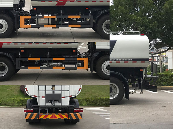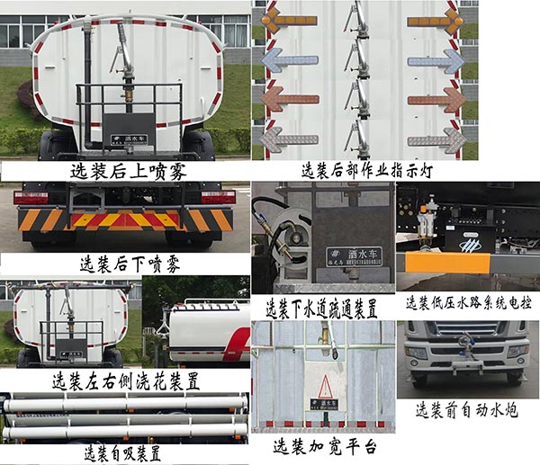| 其他 | 仅选用4500mm轴距;罐体外形长轴×短轴×长度(mm):2400×1450×4650,罐体有效容积:11.59立方米。该车有2种配置:A(标配)、B(选装自动水炮)。 各配置整车长度(mm)/前悬(mm)对应关系如下: 配置A:7950/1400;配置B: 8400/1850;侧防护及后部防护装置的材料材质:Q235B;连接方式为螺栓连接;后部防护装置的断面尺寸(宽×高)mm:60×230;后部防护装置的离地高度480mm。可选装:1、后上喷雾装置;2、后下喷雾装置; 3、加宽平台;4、下水道疏通装置;5、左右侧浇花装置; 6、后部作业指示灯;7、选装低压水路系统电控;8、选装自吸装置。以上8种选装配置引起的重量及整车尺寸变化可以忽略不计。随底盘选装限速装置,限速89km/h;该车装备有罐体,水泵,管道系统等,用于清洗路面,对路面喷洒水降尘等作用。ABS型号/生产厂家:CM4XL-4S/4M/广州瑞立科密汽车电子股份有限公司。 | ||