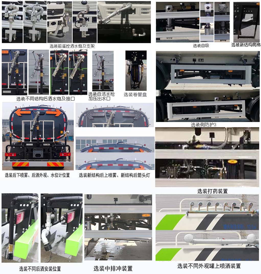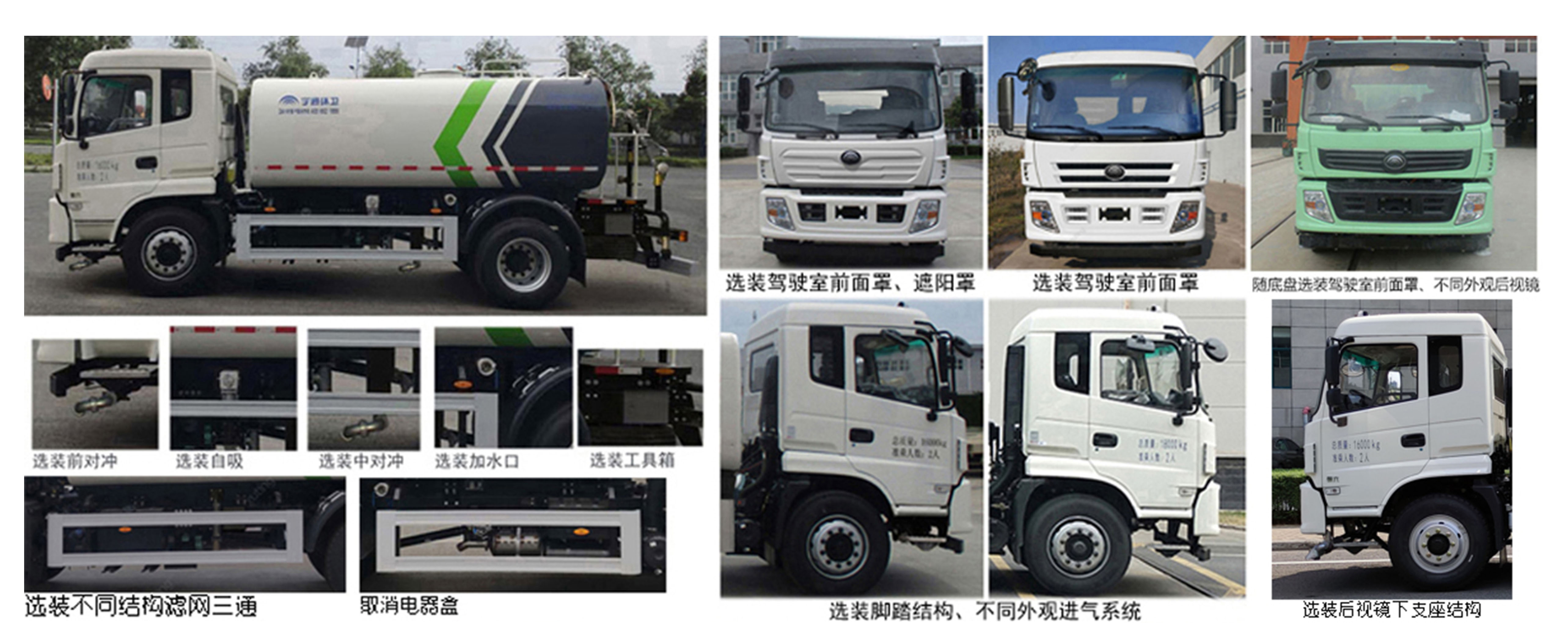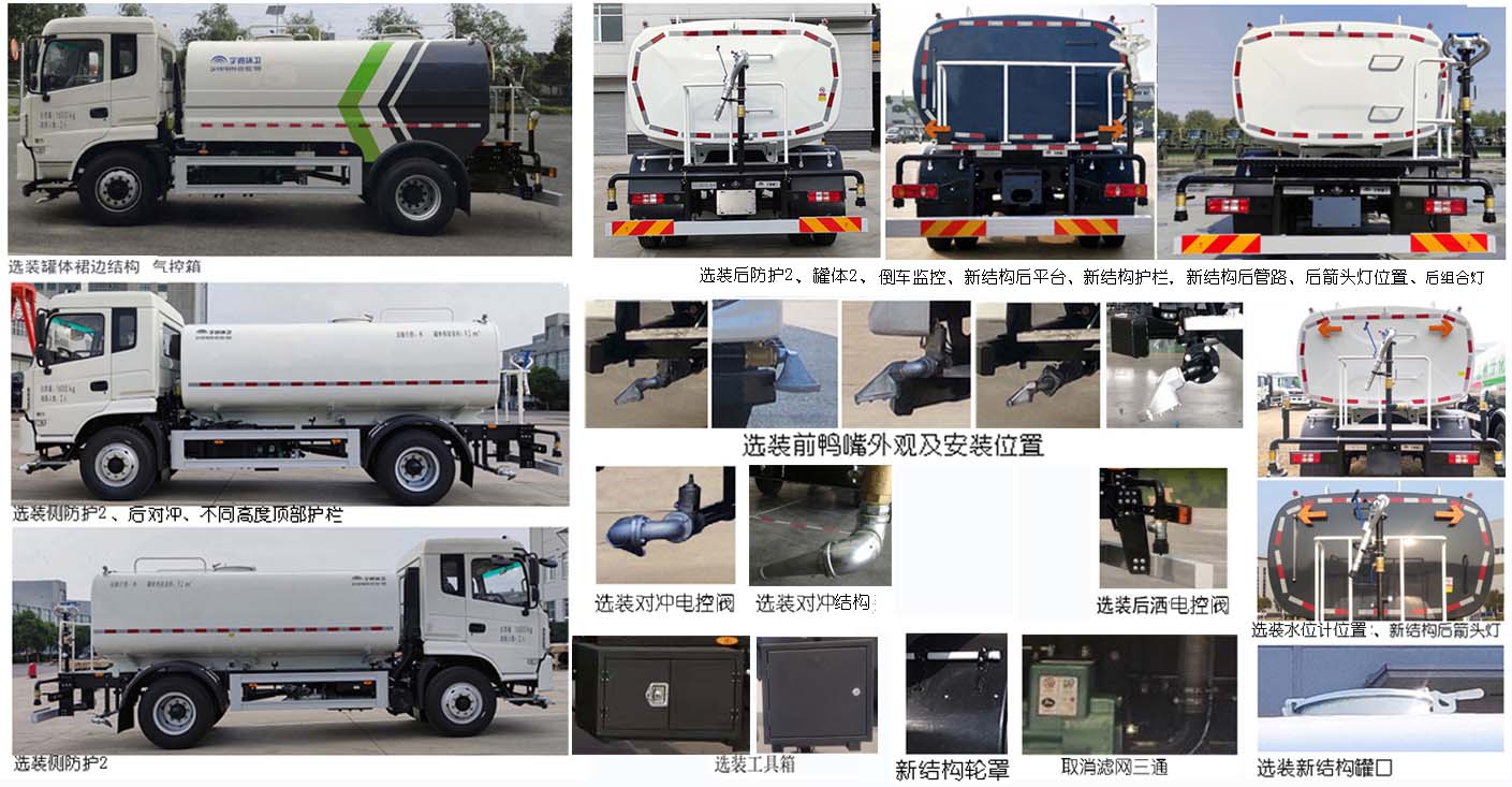 1.罐体有效容积:9.2立方米;罐体1外形尺寸(长轴×短轴×长)为:2390×1390×4200(mm),罐体2外形尺寸(长轴×短轴×长)为:2250×1300×4300(mm)。2.该车可选装3种侧防护装置,侧防护装置材料均为Q355,与车辆均采用螺栓连接;该车可选装2种后防护装置,后防护装置1材料为QStE700TM,与车辆采用螺栓连接,截面尺寸为:160×120(mm),离地高度为:480mm;后防护装置2材料为QStE700TM,与车辆采用螺栓连接,截面尺寸为:120×80(mm),离地高度为:455mm。3.ABS型号/厂家:ABS-E 4S/4M/威伯科汽车控制系统(中国)有限公司;CM4XL-4S/4M/广州瑞立科密汽车电子股份有限公司。4.可选装前遥控洒水炮及支架、不同结构后洒水炮及接口、卷管盘、自洁水枪、加压出水口、后下喷雾、后洒外观、水位计位置、新结构后上喷雾、新结构后箭头灯、自吸、新结构爬梯、前对冲、中对冲、加水口、工具箱、不同结构滤网三通、后视镜下支座结构、罐体裙边结构、气控箱、倒车监控、新结构后平台、新结构护栏、新结构后管路、后箭头灯位置、后组合灯、后对冲、前鸭嘴外观及安装位置、对冲电控阀、后洒电控阀、对冲结构、后洒安装位置、新结构轮罩、水位计位置、新结构罐口、罐上喷洒装置、打药装置、中排冲装置。5、随底盘选装后视镜、驾驶室前面罩、遮阳罩、脚踏结构、不同外观进气系统。6.该车型可取消电器盒、前鸭嘴、对冲、后洒、后箭头灯、后上喷雾、侧喷、后洒水炮接水口、后洒水炮、倒车监控、滤网三通。7.基础车型(带前鸭嘴、标准后平台)对应接近角为15°,离去角为13°,当选装前遥控洒水炮或前对冲时接近角为13°,当基础车型取消前鸭嘴时对应接近角为18°,当选装加大后平台时对应离去角为9°。8、当选装不同高度顶部护栏时对应车高为2865。9.车辆配置/车长(mm)/前伸(mm)/后悬(mm)/整备质量(kg)/额定载质量(kg)对应关系分别为:A(基础车型)/7450/0/2000/6850/9020;B(基础车型+前遥控洒水炮)/8020/570/2000/6850/9020;C(基础车型+加大后平台)/7820/0/2370/7000/8870;D(基础车型+前遥控洒水炮+加大后平台)/8390/570/2370/7000/8870;E(基础车型+罐体2)/7450/0/2000/6380/9490;F(基础车型+罐体2+前遥控洒水炮)/8020/570/2000/6380/9490;H(基础车型+罐体2+加大后平台)/7820/0/2370/6500/9370;I(基础车型+罐体2+加大后平台2)/8010/0/2560/6500/9370。10.该车装有水泵、喷嘴专用装置,用于喷洒路面、对路面进行除尘和降温。11.发动机净功率值:YCS04200-68:143kw。 |