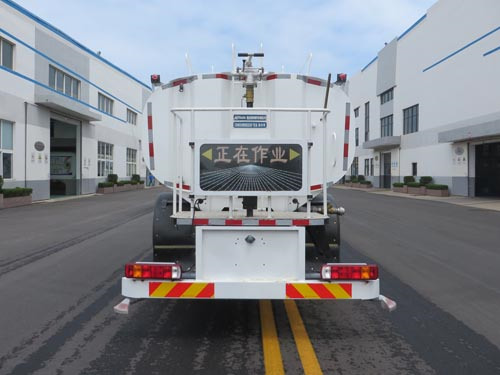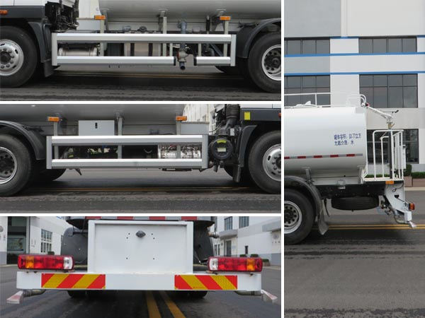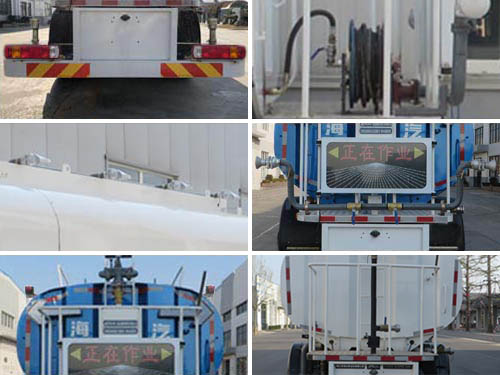 | 其他 | 车辆专用装置为水罐体、水泵和水路系统,主要用于城镇环境清洁作业,对路面洒水降尘,园林绿化.仅选用4500mm轴距.罐体外形尺寸(长轴×短轴×罐长)(mm):2350×1380×4500,有效容积:10.77立方米,介质名称:水,介质密度:1000千克/立方米.随底盘选装限速装置,最高车速80km/h或89km/h.选装前围.选装前智能洒水装置,对应前伸为520mm,车辆长度为8660mm.选装后部圆形喷嘴.选装卷管总成.顶部选装绿化浇灌装置.选装左右绿化浇灌装置.选装箭头式作业指示灯.选装车辆外部标识牌外观及安装位置.选装作业指示灯牌.ABS系统型号/生产企业对应关系:ABS-E/威伯科汽车控制系统(中国)有限公司;ABS/ASR-24V-4S/4M/东科克诺尔商用车制动系统(十堰)有限公司;CM4XL-4S/4M/广州瑞立科密汽车电子股份有限公司;3550D-1010/东科克诺尔商用车制动系统(十堰)有限公司;EBS 5/克诺尔制动系统(大连)有限公司.车辆侧面防护装置的材料材质为铝合金,连接方式为螺栓连接.后下部防护装置的材料材质为Q235钢,连接方式为焊接,断面尺寸(mm)为80×160,最大离地高度为405mm. | ||