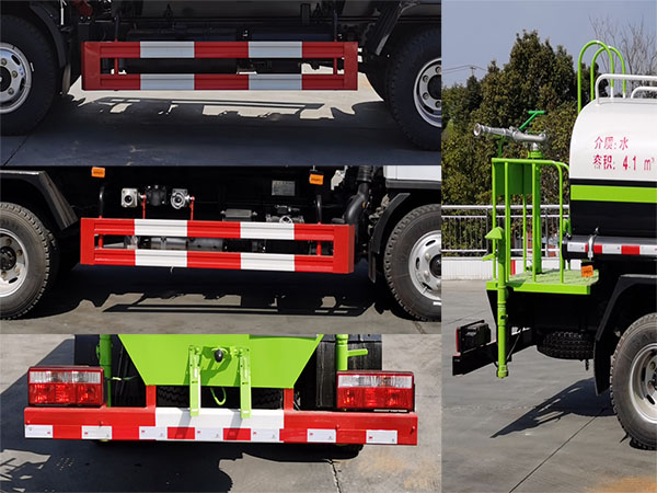 | 其他 | 1.该车装备有水泵,罐体及管路系统等,用于洒水,清洗,降尘等作业;选用底盘3308mm轴距;随底盘选装驾驶室外观;2.侧防护材质Q235,螺栓连接;后下部防护材质Q235,焊接,后下部防护截面尺寸120mm×60mm,离地高420mm;3.罐体外形尺寸(长×长轴×短轴)(mm):3350×1650×1100;罐体有效容积:4.1立方米,介质:水;4.ABS型号/厂家:ABS/ASR-12V-4S/4M/襄阳东风隆诚机械有限责任公司;5.该车可选装ETC车载装置。 | ||