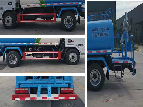 | 其他 | 随底盘选装驾驶室.有效容积4.17立方米。罐体尺寸为(长×长轴×短轴)(毫米):3400×1600×1100,3000×1600×1150。侧防护采用冷弯型钢/Q235-B,螺栓连接,后防护采用冷弯型钢/Q235-B,螺栓连接。后防护截面高度尺寸120mm, 截面宽度尺寸50mm,下边缘离地高度480mm。ABS型号/厂家:ABS/ASR-12V-4S/4M/襄阳东风隆诚机械有限责任公司。该车主要用于园林绿化等工作,主要专用装置为喷雾设备和罐体;罐体采用4mm/Q235B材料,运输介质:丙酮水溶液,密度:每立方米950千克。 | ||