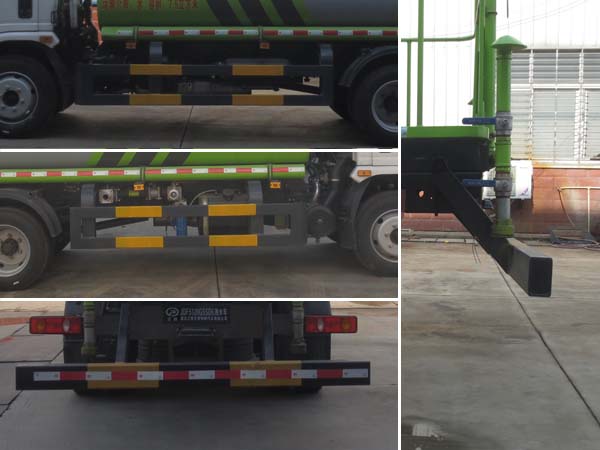 | 其他 | 罐体有效容积7.5立方米;运输介质:水,密度:1000千克/立方米;仅采用底盘3800mm轴距;罐体外形尺寸(长×长轴×短轴)(mm):4200×1980×1280;随底盘选装驾驶室;选装罐体不同外观,选装罐体两侧管道箱样式,选装LED箭头指示灯,选装后弧形喷雾装置,选装前喷鸭嘴样式,选装卷盘;ABS型号及生产厂家为:3631010-C2000/东科克诺尔商用车制动系统(十堰)有限公司,J ABS/焦作博瑞克控制技术有限公司;侧面防护及后下部防护装置材料材质:Q235,连接方式:焊接加螺栓连接;后下部防护装置断面尺寸(宽×高):80×140(mm),离地高度:440mm;主要专用装置为罐体和洒水泵,用于路面冲洗、洒水作业. | ||