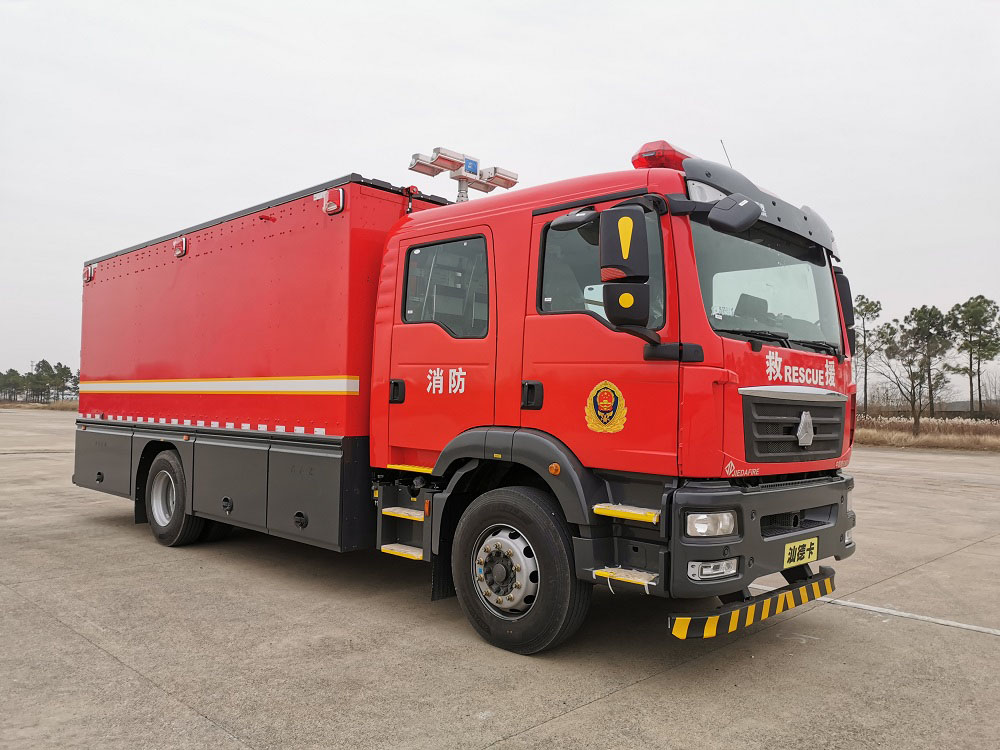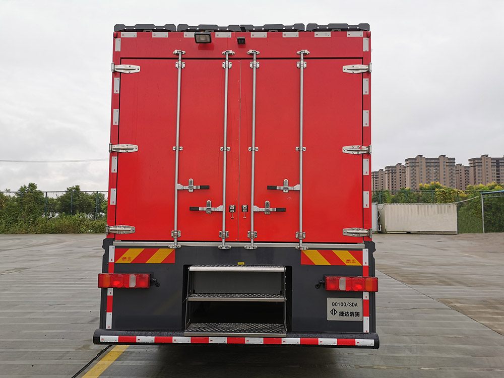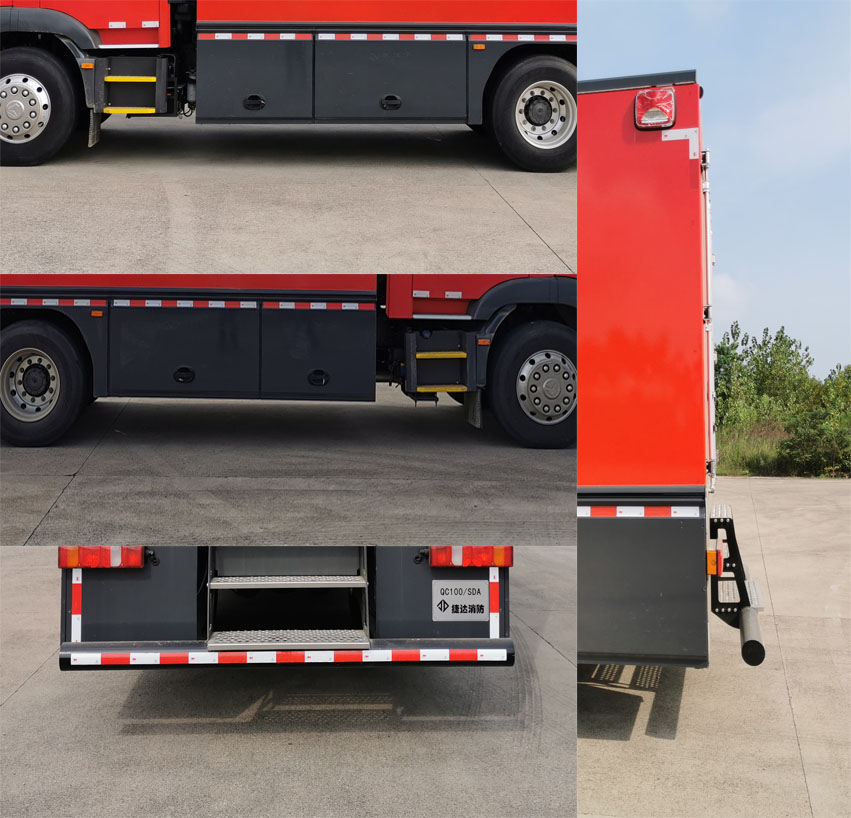 | 其他 | 整体式侧防护结构,后防护装置材料:Q235A,截面尺寸:Ф130mm,与车辆连接方式:螺栓连接,后防护离地高度:400mm。ABS生产企业为威伯科(上海)管理有限公司,型号为4460046300。主要专用装置有抢险救援器材。该车选装升降照明系统时,整车高度为3750mm。 | ||