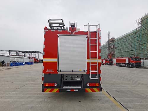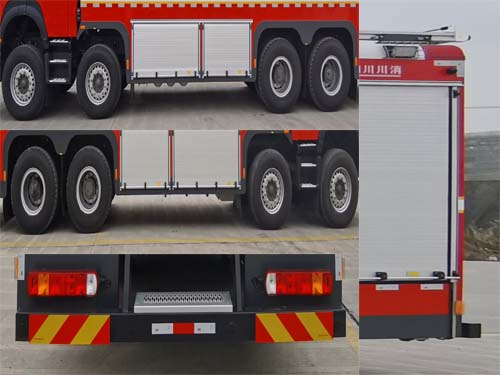| 其他 | 泡沫液罐总容积:23.529立方米,泡沫液罐Ⅰ容积:7.843立方米,泡沫液罐Ⅰ尺寸:2400×2460×1380mm。泡沫液罐Ⅱ容积:15.686立方米,泡沫液罐Ⅱ尺寸:4800×2460×1380mm。整体式侧防护结构,后防护装置材料:Q235A,截面尺寸:80×140mm,与车辆连接方式:螺栓连接,后防护离地高度:460mm,ABS生产企业为威伯科汽车控制系统(中国)有限公司,型号为4460046300。主要专用装置有供液泵。 | ||