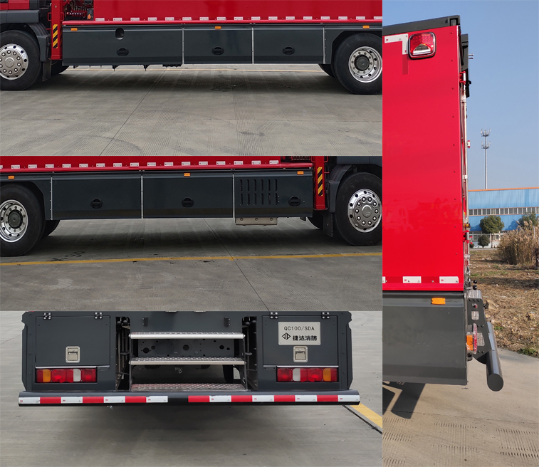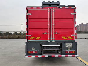 | 其他 | 整体式侧防护结构,后防护装置材料:Q235A,截面尺寸:Φ130mm,与车辆连接方式:螺栓连接,后防护离地高度:495mm。ABS生产企业为威伯科(上海)管理有限公司,型号为4460046300。主要专用装置有随车吊、水带护桥等各类器材。 | ||