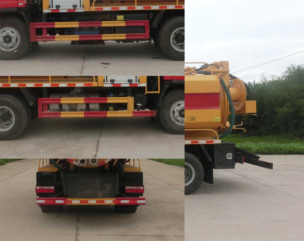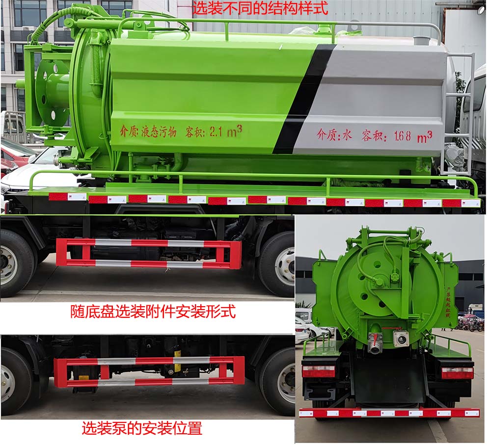 | 其他 | 随底盘选装驾驶室. 罐体外形尺寸(直段长×直径)(mm):3100×1300(其中罐体前部1250mm为清水罐).污水罐载质量1600kg,罐体有效容积2.1立方米,运输介质:液态污物,密度800千克/每立方米.清水罐载质量1600kg,罐体有效容积1.68立方米,运输介质:水,密度1000千克/每立方米.侧、后防护材料为Q235,侧防护螺栓连接,后部防护采用焊接连接.后防护截面高度尺寸100mm,截面宽度尺寸50mm,下边缘离地高度420mm.ABS防抱死制动系统生产厂家/型号:1.浙江万安科技股份有限公司/VIE ABS-II.清水罐和吸污罐为两个独立罐体,清洗功能时用清水罐,吸污功能时用吸污罐,清洗和吸污功能不同时使用,两罐不能同时满载.专用装置为罐体,泵,管道系统,用于清洗吸污作业;罐体带举升功能;随底盘选装附件安装形式,选装泵的安装位置;选装不同的结构样式 | ||