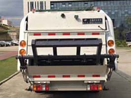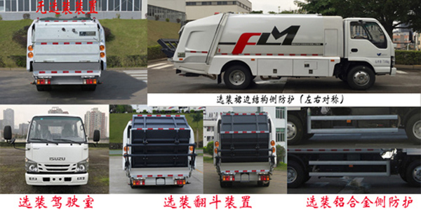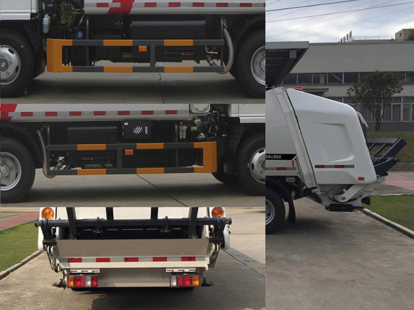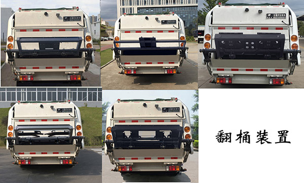 | 其他 | 装置3种:A(翻桶装置)、B(无选装装置)、C(翻斗装置)。各配置整备质量(kg)/额定载质量(kg)/长(mm) /后伸(mm) 对应关系如下:配置A: 5550/1620/6755/640;配置B: 5450/1720/6315/200;配置C: 5550/1620/6570/455。侧防护装置的材料材质:Q235A,连接方式:螺栓联接;专用工作装置代替后部防护,离地高度380mm。以上三种装置均可选装铝合金材质侧防护,或均可选装左右侧裙边结构代替侧防护,左右侧裙边中各窗口的位置和大小可以调整。选装裙边结构时,整备质量/额定载质量分别为:配置A和配置C:5750/1420、配置B:5650/1520。ABS型号/生产企业:APG3550500A/浙江亚太机电股份有限公司,CM4YL/广州瑞立科密汽车电子股份有限公司,CM4XL-4S/4M/广州瑞立科密汽车电子股份有限公司。随底盘装4KH1CN6LB型发动机,对应油耗值为16.1(L/100Km)。随底盘选装驾驶室;该车装备有垃圾箱体,液压机构及垃圾装填器,用于将垃圾自行压实装入,转运和卸料功能。 | ||