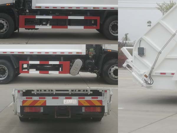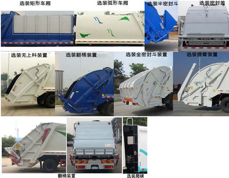 | 其他 | 1、该车主要专用装置由箱体、压缩系统组成,用于垃圾的收集与清运。该车可选装方形或弧形箱体,选装全密封盖装置,选装方形挡泥板。选装后部工作装置。选装爬梯样式。选装工作装置时外形长/前悬/轴距/后伸对应关系为(mm):①无上料装置:7880/1400/3800/1630,7910/1430/3800/1630,8030/1400/3950/1630,8060/1430/3950/1630;②全密封斗装置和摆臂装置:8080/1400/3800/1830,8110/1430/3800/1830,8230/1400/3950/1830,8260/1430/3950/1830;③翻桶装置和翻斗装置:8280/1400/3800/2030,8310/1430/3800/2030,8430/1400/3950/2030,8460/1430/3950/2030。仅采用3800mm,3950mm轴距。2、侧防护采用冷弯型钢/Q235,螺栓连接;后防护由专用装置替代,下边缘离地高:500mm。3、随底盘选装高度不同的驾驶室;选装前雾灯;选装驾驶室顶部装饰灯;选装驾驶室前面罩;选装前保险杠及前部灯具,选装后视镜;选装后部灯具;选装驾驶室前脸扰流罩;驾驶室卧铺侧窗选装装饰板,选装后背式排气管。选装无车门裙板。安装带有卫星定位功能的行驶记录仪。ABS型号/生产厂家:3631010-C2000/东科克诺尔商用车制动系统(十堰)有限公司,ABS 8/东科克诺尔商用车制动系统(十堰)有限公司, 4460046450/威伯科汽车控制系统(中国)有限公司,J ABS/焦作博瑞克控制技术有限公司。采用的发动机与油耗值对应关系为(L/100Km):DDi50E190-60/23.4,D4.5NS6B190/23.5,D6.7NS6B230/23.5,B6.2NS6B210/23.4,B6.2NS6B230/23.4。 | ||