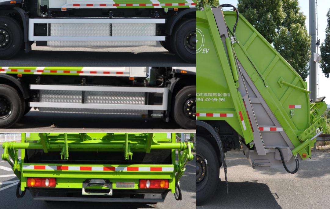 | 其他 | 1.该车选用底盘4500mm轴距,随底盘选装驾驶室外观.2.该车通过垃圾箱,填装机构等装置,达到垃圾收集装填及推挤卸料的作业功能;3.该车有4种配置,分别为:A(标配,翻桶机构)、B(选装摆臂提斗机构)、C(选装全密封斗机构)、D(选装半密封斗机构);配置A时,前悬与整车长对应关系为:1400mm/9060mm,1430mm/9090mm,后悬为2830mm,后伸330mm;配置B,C时,前悬与整车长对应关系为:1400mm/8730mm,1430mm/8760mm,后悬为2830mm,无后伸;配置D时,前悬与整车长对应关系为:1400mm/9110mm,1430mm/9140mm,后悬为2830mm,后伸380mm;4.侧面防护装置的材料为铝合金6061,与车辆连接方式为螺栓连接;后下部防护由上料斗专用装置代替,下边缘离地高度480mm;5.装备具有卫星定位功能的行驶记录仪;随底盘装有ABS,ABS型号/生产企业:J ABS/焦作博瑞克控制技术有限公司,选装直供电式的ETC车载装置.6.储能装置种类/生产企业:磷酸铁锂蓄电池/宁德时代新能源科技股份有限公司;7.驱动电机型号:TZ370XS-LKM1103,额定功率:80kw,峰值功率:160kw. | ||