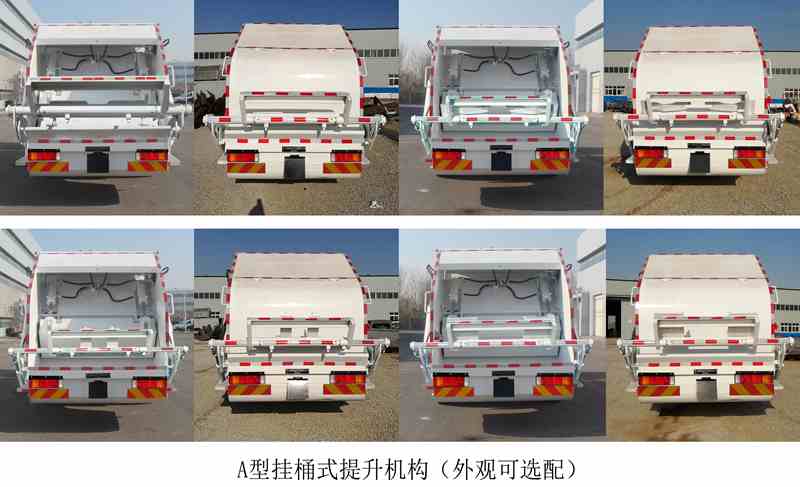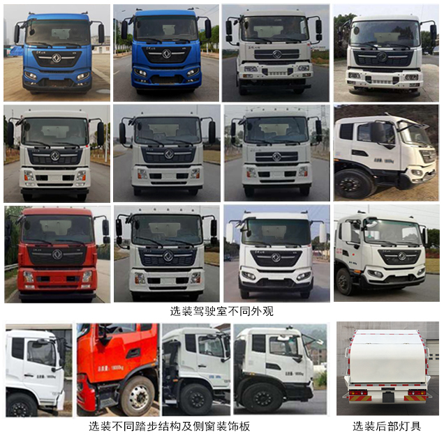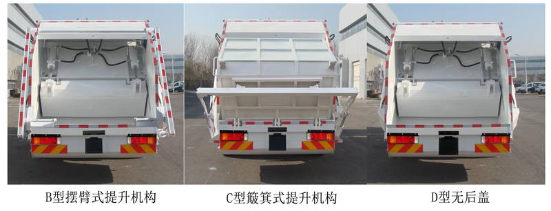| 其他 | 仅用4500mm轴距;该车选装4种配置后部工作机构,配置A型挂桶式提升机构(外观可选配)后伸量570mm,车总长9320mm,额定载质量6065kg,整备质量11740kg;配置B型摆臂式提升机构后伸量590mm,车总长9340mm,额定载质量5985kg,整备质量11820kg;配置C型簸箕式提升机构后伸量770mm,车总长9520mm,额定载质量5965kg,整备质量11840kg;配置D型无后盖,车辆尺寸质量与基础车型相同,质量变化在误差内不计;侧防护装置材质为铝合金,连接方式:螺栓连接;后防护装置由专用作业装置代替,离地高度为460mm;随底盘选装驾驶室不同外观,选装不同踏步结构及侧窗装饰板,选装后部灯具;ABS型号/生产厂家:3631010-C2000/东科克诺尔商用车制动系统(十堰)有限公司,ABS 8/东科克诺尔商用车制动系统(十堰)有限公司,4460046450/威伯科汽车控制系统(中国)有限公司,J ABS/焦作博瑞克控制技术有限公司;安装具有卫星定位功能的行驶记录仪;车辆装有垃圾箱体、填装器、后上料装置,用以收集、处理、转运垃圾作业.发动机与油耗值对应关系为(L/100Km):D4.5NS6B190/24.4,D6.7NS6B230/23.7,DDi50E190-60/23.9,B6.2NS6B210/23.8,B6.2NS6B230/23.8,DDi50E220-60/25.1,D4.0NS6B185/25.2或24.9,D4.0NS6B195/26;该车型可选装ETC车载装置. | ||