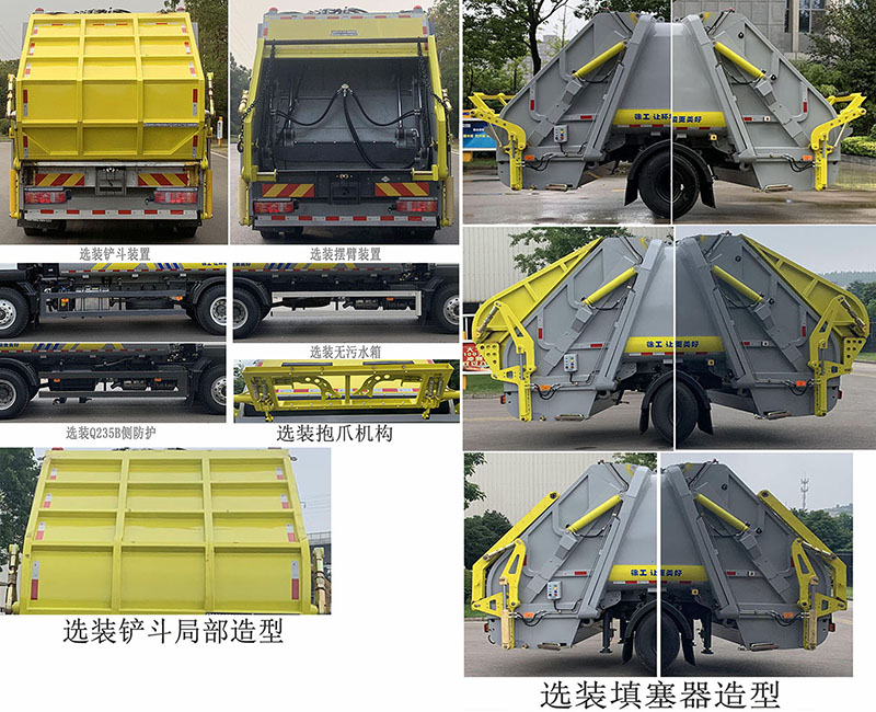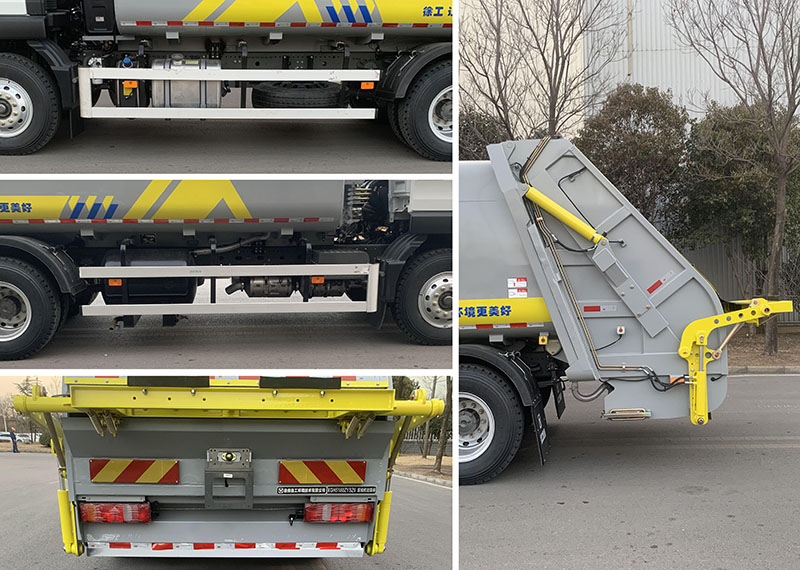 | 其他 | ABS型号:4460046300;ABS生产企业:威伯科(上海)管理有限公司;安装有具有卫星定位功能的行驶记录仪;选装描述:仅选用4500轴距;选装翻桶装置时,长8800mm,后悬2528mm,后伸322mm,整备质量9800kg;选装铲斗装置时,长8695mm,后悬2495mm,后伸250mm,整备质量10125kg;选装摆臂装置时,长8535mm,后悬2520mm,后伸65mm,整备质量9950kg;污水箱为选装件;选装填塞器造型和铲斗局部造型及抱爪机构;随底盘选装普通驾驶室,选装半高顶驾驶室,选装前部、后部组合灯具,选装附件布置;选装EBS,EBS系统控制器生产企业/型号为威伯科(上海)管理有限公司/EBS3;该车可选装车载ETC装置;发动机MC07.27-60可选装限速装置,限速80km/h,同时选装前置排气系统;选装限速装置,限速89km/h;发动机/油耗值(L/100km)对应关系为:MC07.25-60/26.4,MC07.27-60/22.8,MC07.29-60/22.8,MC07H.29-60/25.7,WP4.6NQ220E61/25.3,WP6H245E61/25.3,WP6H270E61/25.7,WP7.270E61/25.3,WP7.300E61/25.3,MC05H.20-60/26.1,MC05H.23-60/26.1,MC05H.25-60/26.1,WP7.270E61/25.3;侧后防护情况:侧防护装置材质为铝合金或Q235B,连接方式为螺栓连接.后防护为专用作业装置替代,离地高度为495mm;专用功能及装置:该车装备有垃圾箱体,液压机构及垃圾装填器,用于垃圾收集、转运等工作;后伸尺寸:322mm,250mm,65mm.选装倒料架样式. | ||