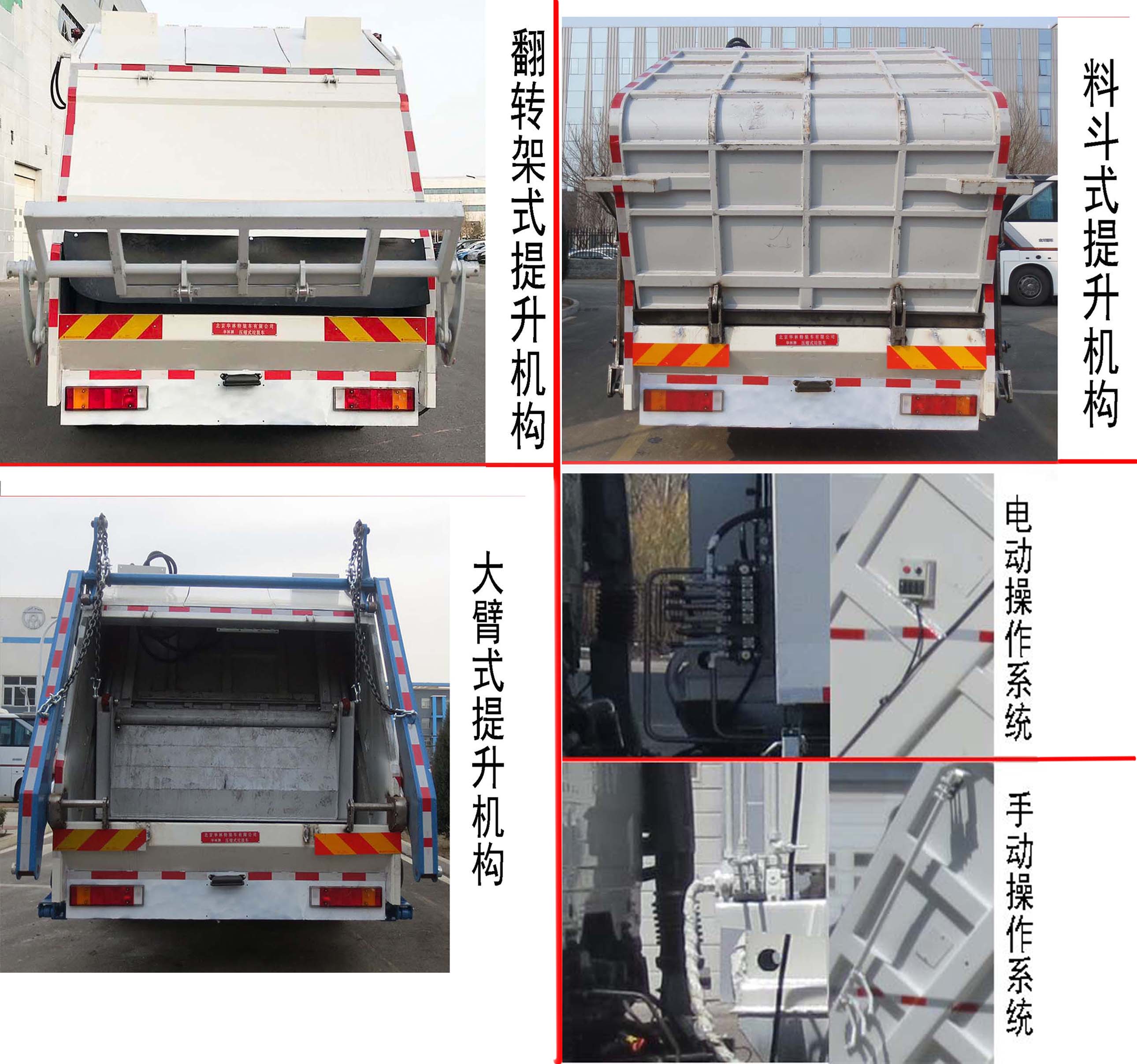 | 其他 | 1、选装翻转架式提升机构后伸量为500mm,车总长为9160mm, 额定载质量为6505kg,整备质量为11300kg。2、选装料斗式提升机构后伸量为450mm,车总长为9110mm,额定载质量为6405kg,整备质量为11400kg。3、选装大臂式提升机构后伸量为290mm,车总长为8950mm,额定载质量为6455kg,整备质量为11350kg。4、侧防护装置所用材料为铝合金,与底盘纵梁螺栓连接;车身结构满足后防护的安装要求,离地高度为495mm。5、该车装置带卫星定位功能的行驶记录仪。6、ABS型号/生产厂家:3631010-C2000/东科克诺尔商用车制动系统(十堰)有限公司,ABS 8/东科克诺尔商用车制动系统(十堰)有限公司, 4460046450/威伯科汽车控制系统(中国)有限公司,J ABS/焦作博瑞克控制技术有限公司。7、仅选用4500mm轴距底盘,随底盘选装驾驶室、后部灯具;随底盘选装限速装置,限速89km/h;随底盘选装后处理隔热罩,车宽2550mm;选装底盘不同布置;选装污水箱。8、本车安装推板、厢体及后门,主要用于储存、装卸及运输垃圾。9、本车装配电动操作系统,可选装手动操作系统。10、选装裙边结构侧防护装置,材质为Q235B,与大厢焊接连接,对整车的整备质量无影响。11、D6.7NS6B230发动机,油耗23.7;D4.5NS6B190发动机,油耗24.4;DDi50E190-60发动机,油耗23.9;B6.2NS6B210发动机,油耗23.8;B6.2NS6B230发动机,油耗23.8;DDi50E220-60发动机,油耗25.1。12、该车型可选装ETC车载装置。 | ||