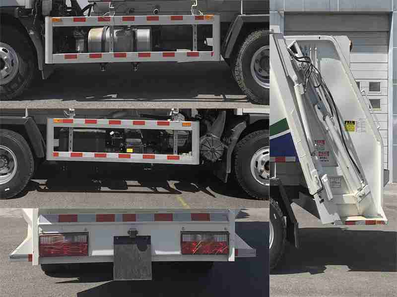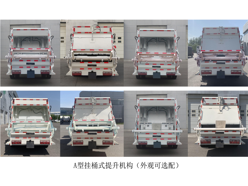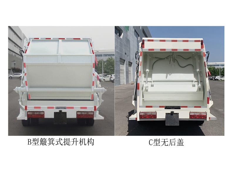 | 其他 | 仅选用3365mm轴距;该车选装3种配置后部工作机构,配置A型挂桶式提升机构(外观可选配)后伸量为380mm,车总长为6870mm,额定载质量2895kg,整备质量为6310kg;配置B型簸箕式提升机构后伸量为550mm,车总长为7040mm,额定载质量2805kg,整备质量为6400kg;配置C型无后盖,车辆尺寸质量与基础车型相同,质量变化在误差内忽略不计;侧防护装置材质为铝合金,连接方式:螺栓连接;后防护由专用作业装置代替,离地高度495mm;D30TCIF2发动机最大净功率为115KW;油耗值为18.2L/100km;ABS系统控制器型号:CM4XL-4S/4M,ABS系统控制器生产厂家:广州瑞立科密汽车电子股份有限公司,选装ABS系统型号/厂家为VIE ABS-Ⅱ/浙江万安科技股份有限公司.车辆装有垃圾箱体、填装器、后上料装置,用以收集、处理、转运垃圾作业.该车型可选装ETC车载装置.随底盘选装驾驶室,选装后尾灯,选装铁油箱. | ||
