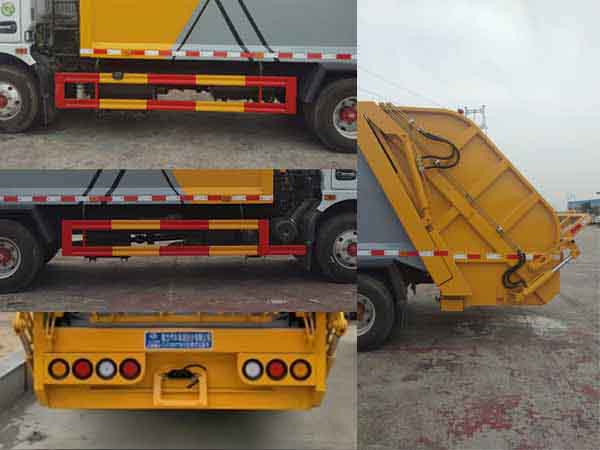 | 其他 | 1.随底盘选装前面罩,前保险杠,前组合灯具,前雾灯,尾灯;2.ABS型号/厂家:ABS型号:ABS/ASR-24V-4S/4M,厂家:襄阳东风隆诚机械有限责任公司;3.采用的发动机型号与油耗值(100km/L)对应关系为:YCY24140-60/16.5;ZD30D16-6N/17.2;D25TCIF1/17.1,D30TCIF1/17.3,NV30-C6G/17.3,NV30-C6D/17.1;4.防护材料:Q235碳钢,连接方式:左右侧面防护采用螺栓连接,离地高度400mm,后部防护由专用装置代替豁免,离地高度430mm;5.该车主要专用装置由箱体、压缩系统组成,用于垃圾的收集与清运。该车可选装方形或弧形箱体,选装全密封盖装置,选装后部工作装置。选装工作装置时,选装工作装置时,外形长(mm)前后悬(mm)/轴距(mm)/后悬(mm) /后伸量(mm)对应关系::①无上料装置:7400=1130+3800+2470(无后伸量),②翻桶和三角斗装置:7800=1130+3800+2470+400(后伸量);③摆臂和全密封装置:7600=1130+3800+2470+200(后伸量),此车型仅采用轴距:3800mm, | ||