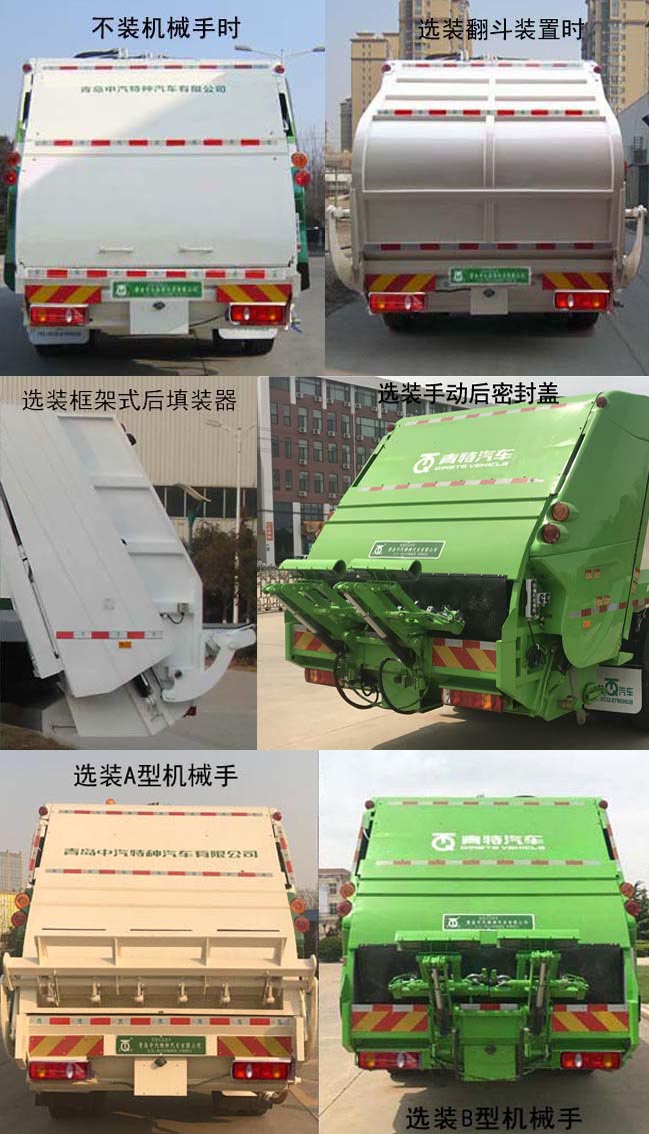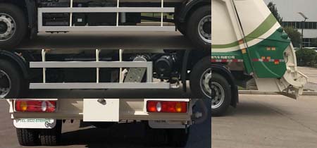 | 其他 | 仅采用4500mm轴距底盘。该车有4种配置:A(不带机械手)B(选装翻斗装置)C(选装A型机械手)D(选装B型机械手)。随底盘选装驾驶室,对应1400mm或1430mm两种前悬;车辆总长/前悬/后悬对应关系:配置A(不带机械手)时8250mm/1400mm/2350mm,8350mm/1400mm/2450mm,8280mm/1430mm/2350mm,8380mm/1430mm/2450mm,整备质量10450kg,载质量7420kg、7355kg.配置B(选装翻斗装置后伸300mm)时8550mm/1400mm/2350mm,8580mm/1430mm/2350mm,整备质量10750kg,载质量7120kg、7055kg.配置C(选装A型机械手后伸300mm)时8650mm/1400mm/2450mm,8680mm/1430mm/2450mm,整备质量10750kg,载质量7120kg、7055kg.配置D(选装B型机械手后伸620mm)时8970mm/1400mm/2450mm, 9000mm/1430mm/2450mm,整备质量10750kg,载质量7120kg、7055kg.该车装备有垃圾厢体、液压机构及垃圾填料器,用于将垃圾自行压实装入、转运和卸料功能.侧防护栏材质:5083铝合金,连接方式:螺栓连接;后防护由专用装置替代,材料T700,离地高度490mm.ABS型号/生产厂家:3631010-C2000/东科克诺尔商用车制动系统(十堰)有限公司,ABS 8/东科克诺尔商用车制动系统(十堰)有限公司, 4460046450/威伯科汽车控制系统(中国)有限公司,J ABS/焦作博瑞克控制技术有限公司.随底盘选装D6.7NS6B230,B6.2NS6B210,B6.2NS6B230,DDi50E190-60,D4.5NS6B190,对应的油耗值(L/100km)分别为:23.7,23.8,23.8,23.9,24.4.装有带卫星定位功能的行驶记录仪.随底盘选装驾驶室.选装框架填装器,选装手动后密封盖.选装外观喷涂、气动后盖. | ||