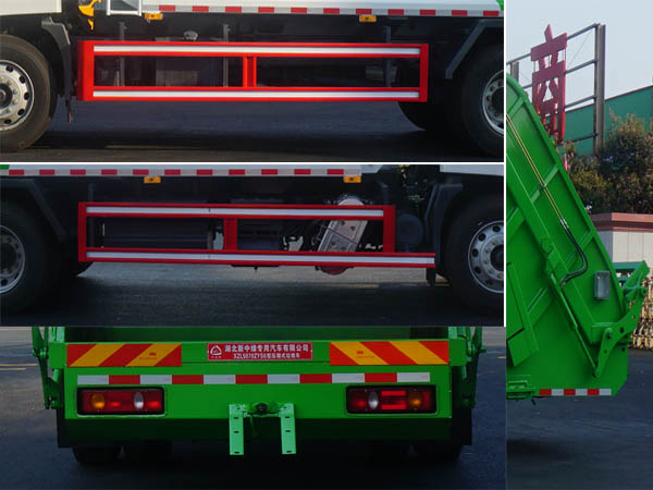 该车型主要用于各类垃圾清理及运输,主要装置为压缩厢体及填充器.选装厢体结构,选装全密封盖,选装填充器侧部及后部翻转机构结构.选装厢体结构及选装全密封盖及选装填充器侧部及后部翻转机构结构时引起整备质量参数的变化在3%范围内.后部翻转机构为无翻转式,轴距(mm)/前悬(mm)/后伸(mm)/外形长(mm)对应关系为:3950/1400(1430)/1300(1270)/8150,4500/1400(1430)/1300(1270)/8700,4700/1400(1430)/1300(1270)/8900.后部翻转机构为摆臂式,轴距(mm)/前悬(mm)/后伸(mm)/外形长(mm)对应关系为:3950/1400(1430)/1400(1370)/8250,4500/1400(1430)/1400(1370)/8800,4700/1400(1430)/1400(1370)/9000.后部翻转机构为挂筒式,轴距(mm)/前悬(mm)/后伸(mm)/外形长(mm)对应关系为:3950/1400(1430)/1650(1620)/8500,4500/1400(1430)/1650(1620)/9050,4700/1400(1430)/1650(1620)/9250.后部翻转机构为带斗式,轴距(mm)/前悬(mm)/后伸(mm)/外形长(mm)对应关系为:3950/1400(1430)/1700(1670)/8550,4500/1400(1430)/1700(1670)/9100,4700/1400(1430)/1700(1670)/9300(mm).侧防护材料为Q235,连接方式为连接支架固焊在副车架大梁上.因后部结构需要无法安装,后防护专用装置代替,只测离地高为450(mm).随底盘选装高度不同的驾驶室;选装前雾灯;选装驾驶室顶部装饰灯;选装驾驶室前面罩;选装前保险杠及前部灯具,选装后视镜;选装驾驶室轮罩;驾驶室前脸扰流罩为选装件;装有具有卫星定位的行车记录仪.ABS型号/生产厂家:3631010-C2000/东科克诺尔商用车制动系统(十堰)有限公司,ABS 8/东科克诺尔商用车制动系统(十堰)有限公司, 4460046450/威伯科汽车控制系统(中国)有限公司,J ABS/焦作博瑞克控制技术有限公司.发动机(油耗值)对应关系:D4.5NS6B190(24.4);D6.7NS6B230(23.7);DDi50E190-60(23.9);B6.2NS6B210(23.8);B6.2NS6B230(23.8).仅采用3950(mm),4500(mm),4700(mm)轴距底盘.选装高度不同的驾驶室;选装前雾灯;选装驾驶室顶部装饰灯;选装驾驶室前面罩;选装前保险杠及前部灯具,选装后视镜;选装后部灯具;驾驶室前脸扰流罩为选装件;驾驶室卧铺侧窗选装装饰板. |