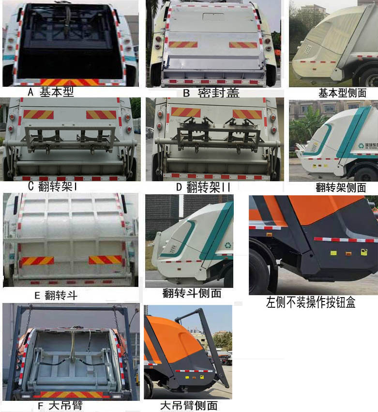 | 其他 | 该车通过垃圾箱,填装机构等装置,达到垃圾收集装填及推挤卸料的作业功能。选用3800mm轴距。随底盘选装驾驶室。选择不装尾部左侧操作按钮盒。选装无备胎。随底盘安装的发动机D4.5NS6B190,DDi50E190-60,B6.2NS6B210油耗值(L/100km)为:20.8,20.5,20.9。当前悬为1400mm时,长度有7665mm,7980mm,8160mm;当前悬为1430mm时,长度有7695mm,8010mm,8190mm。选装尾部专用装置:A(基本型)、B(密封盖)、C(翻转架I)、D(翻转架II)、E(翻转斗)、F(大吊臂),选装尾部专用装置时外廓尺寸长/后伸/整备质量的参数对应关系:A-7665、7695/0/9690,B-7665、7695/0/10100,C或D-8160、8190/495/10100,E-7980、8010/315/10280,F-8160、8190/495/10280。侧护栏的材质为铝合金,采用螺栓连接;后工作装置充当后防护装置的最大离地高度420mm。该车安装具有卫星定位功能的行驶记录仪。随底盘安装ABS,ABS型号/生产厂家:3631010-C2000/东科克诺尔商用车制动系统(十堰)有限公司,ABS 8/东科克诺尔商用车制动系统(十堰)有限公司, 4460046450/威伯科汽车控制系统(中国)有限公司,J ABS/焦作博瑞克控制技术有限公司。该车可选装直接供电式ETC车载装置。 | ||