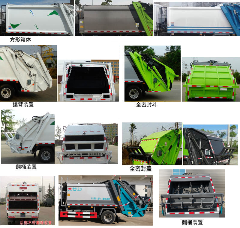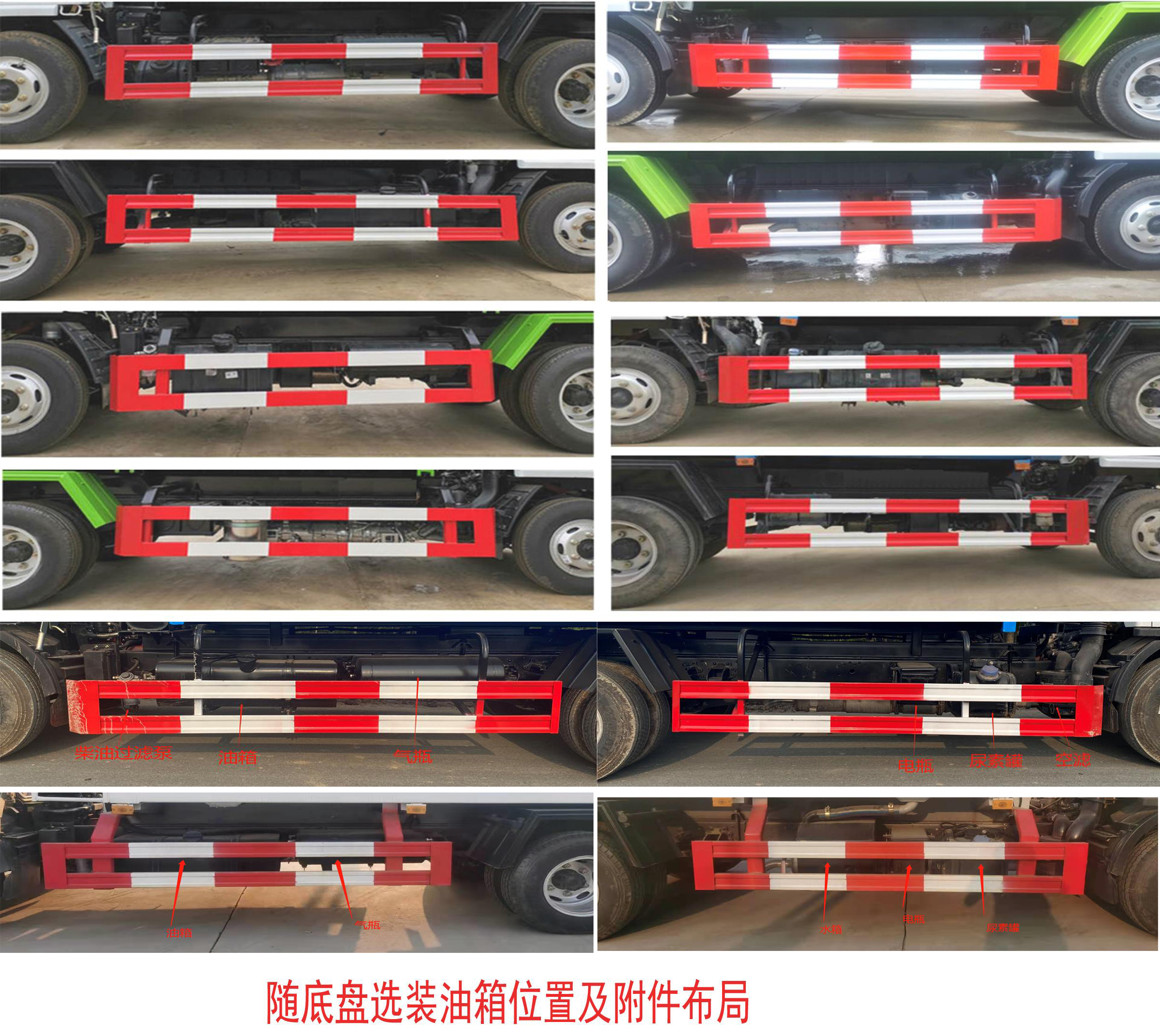 | 其他 | 该车型主要用于各类垃圾清理及运输,主要装置为压缩厢体及填充器.该车可选装方形箱体;选装后密封盖装置;选装后部工作装置;选装翻桶装置及半密封斗装置时,后伸量为470(mm),对应整车长为6850(mm).选装翻桶装置及全密封斗装置时,后伸量为230(mm),对应整车长为6610(mm).选装无上料装置和摆臂装置时,后伸量为0(mm),对应整车长为6380(mm).侧防护材料为Q235,连接方式为螺栓连接.后防护由后部装置替代,离地高为400(mm).随底盘选装驾驶室.随底盘选装油箱位置及附件布局.ABS型号/厂家:ABS/ASR-12V-4S/4M/襄阳东风隆诚机械有限责任公司.仅采用3308(mm)轴距底盘.装配CA4DB1-11E6,CY4BK161,CY4BK461,D20TCIF1,YCY24140-60,ZD30D16-6N,Q23-115E60,H20-120E60,CA4DB1-13E6,Q28-130E60发动机对应油耗分别为16.3,16.2,16.2,16.3,16.3,16.3,14.5,14.9,16.2,15.9L/100km. | ||