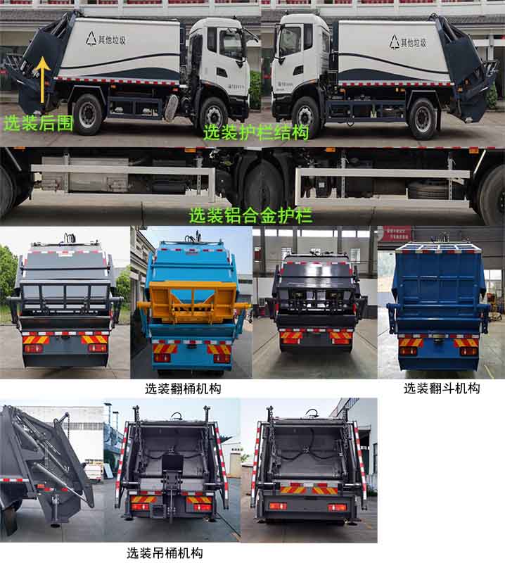 | 其他 | 1.该车为垃圾收集转运专用车辆,专用装置由垃圾箱体、上料机构等组成;2.随底盘选装高度不同的驾驶室,顶部装饰灯,后视镜,前面罩,前保险杠及前后部灯具;选装驾驶室卧铺侧窗装饰板;选装不同结构车门裙板;选装前下视镜及前雾灯;3.选装侧面裙边结构(宽2550mm),选装后围,选装不同上料机构,后伸分别为320mm,590mm,由选装引起质量变化和长度变化,前悬1400mm对应轴距/后伸/整车长度分别为(mm):4500/0/8440,4500/320/8760,4500/590/9030,3950/0/7890,3950/320/8210,3950/590/8480;前悬1430mm对应轴距/后伸/整车长度分别为(mm):4500/0/8470,4500/320/8790,4500/590/9060,3950/0/7920,3950/320/8240,3950/590/8510;3.侧防护材质为Q235(选装铝合金材质),螺栓连接;后下部防护由专用装置替代,最大离地高度为500mm;4.安装具有卫星定位功能的行驶记录仪;该车可选装ETC车载装置;5.发动机D4.5NS6B190,D6.7NS6B230,DDi50E190-60,B6.2NS6B210,B6.2NS6B230,DDi50E220-60油耗值(L/100km)分别为: 24.4,23.7,23.9,23.8,23.8,25.1;6.安装ABS型号/生产厂家:3631010-C2000/东科克诺尔商用车制动系统(十堰)有限公司,ABS 8/东科克诺尔商用车制动系统(十堰)有限公司,4460046450/威伯科汽车控制系统(中国)有限公司,J ABS/焦作博瑞克控制技术有限公司。 | ||