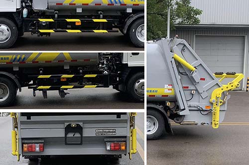 ABS型号:APG3550500A,CM4YL,CM4XL-4S/4M;ABS生产企业:浙江亚太机电股份有限公司,广州瑞立科密汽车电子股份有限公司,广州瑞立科密汽车电子股份有限公司,选装描述:选装翻桶装置时,长6700mm,后悬1985mm,后伸340mm,整备质量5295kg;选装铲斗装置时,长6590mm,后悬2055mm,后伸160mm,整备质量5550kg;污水箱为选装件;填塞器盖板为选装件;随底盘选装制动系统,装液压制动系统时,ABS及其控制器型号/生产企业对应关系为:APG3550500A/浙江亚太机电股份有限公司,CM4YL/广州瑞立科密汽车电子股份有限公司;装气压制动系统时,ABS及其控制器型号/生产企业对应关系为:CM4XL-4S/4M/广州瑞立科密汽车电子股份有限公司;选装一种仅变化前面板、前格栅、前组合灯具的驾驶室;选装后视镜款式;选装前部标牌“4KENGING/NJR/NHR/NKR/100P”;该车可选装ETC车载装置;发动机/油耗值(L/100km)对应关系为:4KH1CN6LB/15.9;侧后防护情况:侧防护材料为Q235B,连接方式螺栓连接;后防护为专用装置替代,离地高度325mm;专用功能及装置:该车装备有垃圾箱体,液压机构及垃圾装填器,用于垃圾收集、转运等工作;;后伸尺寸:340mm,160mm; |