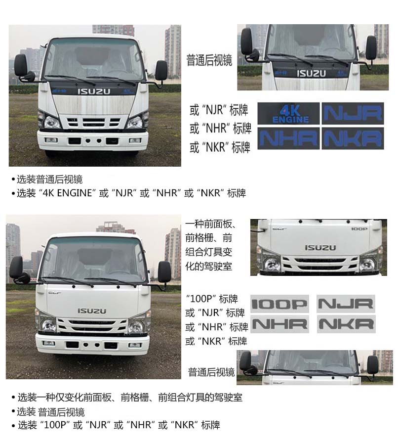 | 其他 | 1、该车主要专用装置由箱体、压缩系统组成,用于垃圾的收集与清运。该车可选装方形或弧形箱体,选装全密封盖装置,选装箱体前部不装爬梯,选装后部工作装置。选装工作装置时,外形长(mm)/后伸(mm)/整备质量(kg)对应关系:①无上料装置: 6465/-/5340;②摆臂装置: 6625/160/5500;③全密封斗装置: 6665/200/5500;④翻桶装置,半密封斗装置: 6865/400/5340。2、侧防护采用Q235,螺栓连接;后防护由专用装置替代,下边缘离地高500mm。3、随底盘选装一种仅变化前面板、前格栅、前组合灯具的驾驶室;选装后视镜款式;选装前部标牌“4K ENGING/NJR/NHR/NKR/100P”。ABS型号/生产企业对应关系为:APG3550500A/浙江亚太机电股份有限公司,CM4YL/广州瑞立科密汽车电子股份有限公司;CM4XL-4S/4M/广州瑞立科密汽车电子股份有限公司;4、发动机4KH1CN6LB的油耗值为15.9L/100Km。5、该车型可选装ETC装置。 | ||