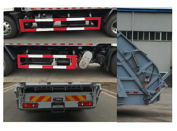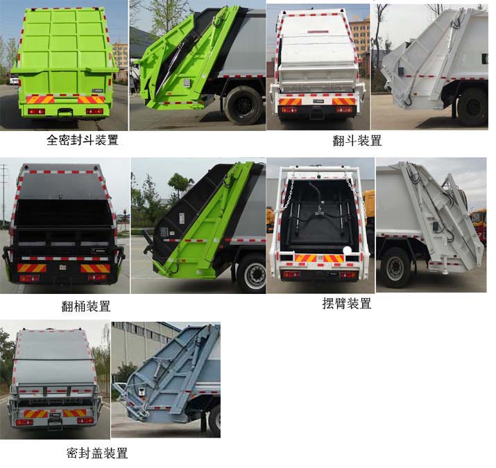 | 其他 | 该车装备有垃圾箱体及垃圾装填器等专用装置,用于将垃圾自行压实装入,转运和卸料。随底盘选装选装驾驶室;选装前雾灯;选装驾驶室顶部装饰灯;选装驾驶室前面罩;选装前保险杠及前部灯具选装驾驶室前脸扰流罩;驾驶室卧铺侧窗选装装饰板,选装后背式排气管。选装后部工作装置。选装后部工作装置时外形长(mm)/前悬(mm)/轴距(mm)/后伸(mm)/整备质量(kg)对应关系为:①无上料装置:8680/1400/4500/200/10850,8710/1430/4500/200/10850,8880/1400/4700/200/10850,8910/1430/4700/200/10850;②全密封斗装置和摆臂装置:8880/1400/4500/400/11190,8910/1430/4500/400/11190,9080/1400/4700/400/11190,9110/1430/4700/400/11190;③密封盖、翻桶装置和翻斗装置:9080/1400/4500/600/11190,9110/1430/4500/600/11190,9280/1400/4700/600/11190,9310/1430/4700/600/11190。侧防护材料为Q235,连接方式为:螺栓连接,后防护为专用装置替代,离地高度为430mm.该车加装具有卫星定位功能的行驶记录仪.ABS型号/生产厂家:3631010-C2000/东科克诺尔商用车制动系统(十堰)有限公司,ABS 8/东科克诺尔商用车制动系统(十堰)有限公司, 4460046450/威伯科汽车控制系统(中国)有限公司.发动机D4.5NS6B190,D6.7NS6B230,DDi50E190-60,B6.2NS6B210,B6.2NS6B230对应的油耗申报值(L/100km)分别为24.4,23.7,23.9,23.8,23.8.随底盘选装驾驶室。 | ||