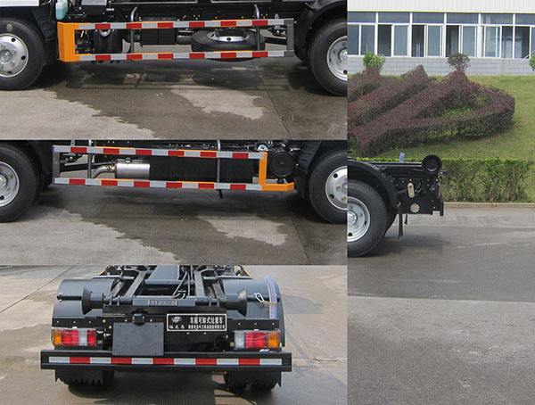 | 其他 | 侧防护的装置的材料材质:Q235B;联接方式:螺栓联接;后防护的装置的材料材质:Q345B;联接方式:螺栓联接;后部防护装置的断面尺寸(宽×高)mm:36×140;后防护离地高为440mm。该车可选装铝合金材质侧防护、侧置污水箱,上述2种选装对尺寸及重量的影响可以忽略不计。随底盘选装一种仅变化前面板、前格栅、前组合灯具的驾驶室、选装前部标牌。随底盘装4KH1CN6LB发动机,油耗值(L/100km)为:16.1。ABS型号/生产企业:APG3550500A/浙江亚太机电股份有限公司,CM4YL/广州瑞立科密汽车电子股份有限公司;CM4XL-4S/4M/广州瑞立科密汽车电子股份有限公司。该车主要由液压控制系统控制专用吊臂的起吊、拉装工作,从而实现放置在地面的装载有生活垃圾的垃圾箱体的转运功能。 | ||
