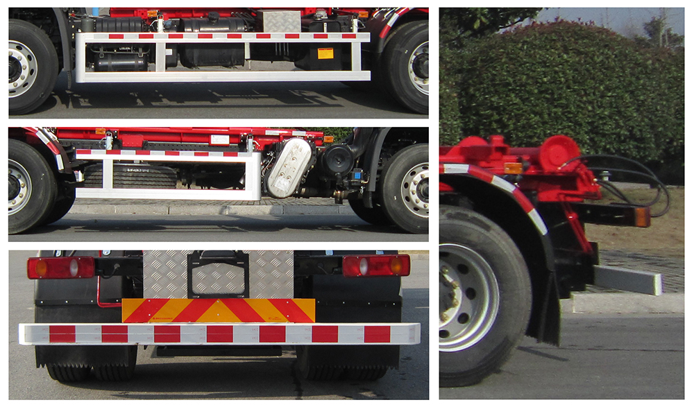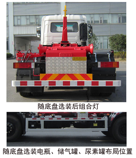 | 其他 | 具有拉臂总成工作装置及垃圾运输功能.仅选用4500mm轴距.随底盘选装高度不同的驾驶室;选装驾驶室顶部装饰灯;选装前雾灯;选装驾驶室前面罩;选装前保险杠及前部灯具,选装后视镜;选装驾驶室前脸扰流罩;选装后组合灯;选装电瓶、储气罐、尿素罐布局位置.左右侧防护装置采用铝型材,用螺栓螺母固定于固定车架左右纵梁上;后防护装置采用120×80×5的空心型钢(Q235A)与厚为8mm的钢板(Q345B)支架焊接而成,再用螺栓、螺母固定于大梁两侧,离地高度为480mm.驾驶室准乘人数--额定载质量对应关系:3--9545;2--9610;安装具有卫星定位功能的行驶记录仪.安装ABS,ABS型号/生产厂家:3631010-C2000/东科克诺尔商用车制动系统(十堰)有限公司,ABS 8/东科克诺尔商用车制动系统(十堰)有限公司, 4460046450/威伯科汽车控制系统(中国)有限公司. 发动机(油耗值)对应关系:D4.5NS6B190(24.4);D6.7NS6B230(23.7);DDi50E190-60(23.9);B6.2NS6B210(23.8);B6.2NS6B230(23.8);DDi50E220-60(25.1);D4.0NS6B185(手动变速) (25.2);D4.0NS6B185 (自动变速箱) (24.9);D4.0NS6B195(26).该车型可选装ETC车载装置. | ||