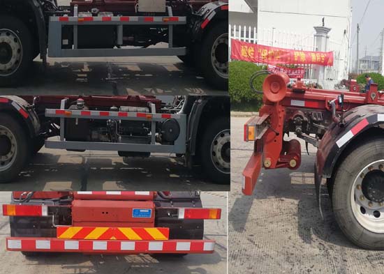 | 其他 | 侧防、后防材质为Q345,后防护装置断面尺寸150×100mm,侧后防连接方式:螺栓连接。后防离地高度为425 mm。ABS型号:ABS 8,4460046450,3631010-C2000;生产厂家分别为:东科克诺尔商用车制动系统(十堰)有限公司,威伯科汽车控制系统(中国)有限公司,东科克诺尔商用车制动系统(十堰)有限公司。选装前雾灯;驾驶室卧铺侧窗选装装饰板.驾驶室前脸扰流罩为选装件.驾驶室顶部中间三个装饰灯为选装件.选装驾驶室前面罩、前保险杠及前部灯具、后视镜。选装不同的踏步型式。装配D4.5NS6B190、DDi50E190-60、B6.2NS6B210发动机油耗值为20.8L/100KM、20.5L/100KM、20.9L/100KM.轴距选用3800mm。该车主要通过液压拉臂装置将装载有垃圾的垃圾箱体自行装上该车,并进行转运和倾卸垃圾箱体的功用.该车安装具有卫星定位功能的行驶记录仪;可选装不装快插支架。可选装勾心高度低的拉臂上装,高度为2840mm,2800mm。轴距选用3800mm。可选装前置阀支架。随底盘选装驾驶室。选装ABS型号及厂家:J ABS/焦作博瑞克控制技术有限公司.选装直接供电ETC装置。 | ||