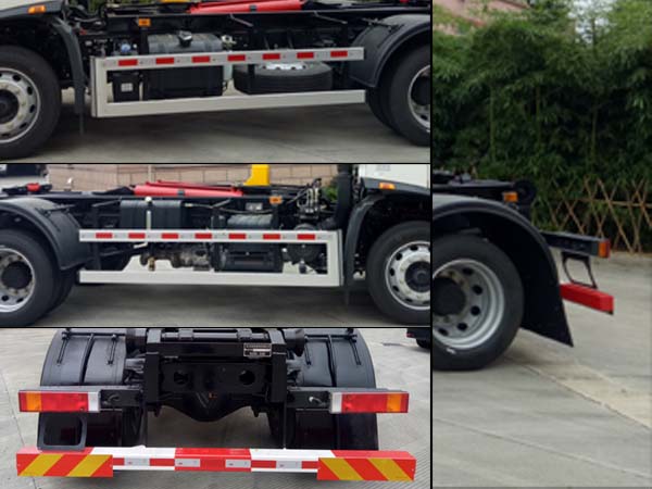| 其他 | 该车装有拉臂机构、液压机构,用于对垃圾箱体的装载和运输;随底盘选装驾驶室外观;安装带卫星定位功能的行驶记录仪;ABS型号/生产厂家:3631010-C2000/东科克诺尔商用车制动系统(十堰)有限公司、ABS 8/东科克诺尔商用车制动系统(十堰)有限公司、4460046450/威伯科汽车控制系统(中国)有限公司、J ABS/焦作博瑞克控制技术有限公司;D4.5NS6B190、DDi50E190-60、B6.2NS6B210发动机对应的油耗申报值(L/100km)分别为:20.8、20.5、20.9;侧防护材质为铝合金,与车辆连接方式为螺栓连接,后防护材质为Q345B,与车辆连接方式为螺栓连接,后防护断面尺寸/离地高:120×100/390(mm);该车型可选装ETC车载装置。 | ||