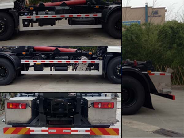 | 其他 | 该车装有拉臂机构、液压机构,用于对垃圾箱体的装载和运输;随底盘选装驾驶室外观;安装带卫星定位功能的行驶记录仪;ABS型号/生产厂家:3631010-C2000/东科克诺尔商用车制动系统(十堰)有限公司、ABS 8/东科克诺尔商用车制动系统(十堰)有限公司、4460046450/威伯科汽车控制系统(中国)有限公司、J ABS/焦作博瑞克控制技术有限公司;D4.5NS6B190、D6.7NS6B230、DDi50E190-60、B6.2NS6B210、B6.2NS6B230发动机对应的油耗申报值(L/100km)分别为:24.4、23.7、23.9、23.8、23.8;侧防护材质为铝合金,与车辆连接方式为螺栓连接,后防护材质为Q345B,与车辆连接方式为焊接,后防护断面尺寸/离地高:120×60/390(mm)。 | ||