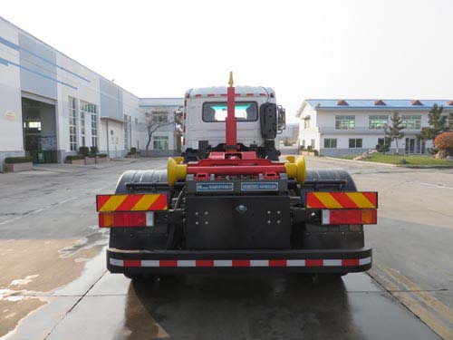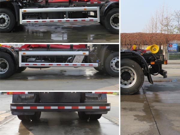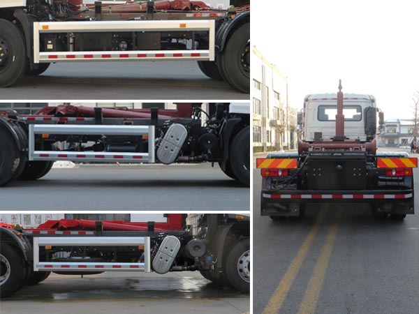| 其他 | 车辆主要用于城乡垃圾的收集、中转和运输,专用装置为装卸功能的拉臂钩.仅选用4500mm轴距.随底盘选装限速装置,限速89.选装无车门裙板.选装不同结构的车门裙板.选装驾驶室卧铺侧窗装饰板.选装前雾灯.选装前下视镜.选装与车身颜色相同的前保险杠.选装踏步结构.驾驶室前脸扰流罩为选装件.选装驾驶室顶部装饰灯.选装后视镜.选装驾驶室前面罩.选装前保险杠及前部灯具.选装配件安装位置.选装右侧防护装置外观.选装后部灯具.选装新式车辆外部标识牌.选装ETC车载装置.前悬(mm)/长度(mm)对应关系为:1400/7065,1430/7095.整备质量(kg)/额定载质量(kg)/驾驶室准乘人数(人)对应关系为:8210/9660/2,8210/9595/3,7470/10400/2,7470/10335/3.发动机型号/油耗申报值(L/100km)对应关系为:D4.5NS6B190/24.4,D6.7NS6B230/23.7,DDi50E190-60/23.9,B6.2NS6B210/23.8,B6.2NS6B230/23.8,DDi50E220-60/25.1,D4.0NS6B185/25.2.安装具有卫星定位功能的行驶记录仪.ABS型号/生产厂家:3631010-C2000/东科克诺尔商用车制动系统(十堰)有限公司,ABS 8/东科克诺尔商用车制动系统(十堰)有限公司,4460046450/威伯科汽车控制系统(中国)有限公司.车辆侧面防护装置的材料材质为铝合金,后下部防护装置的材料材质为Q235钢,连接方式均为螺栓连接,后下部防护装置的断面尺寸(mm)为65×175,最大离地高度为455mm. | ||
