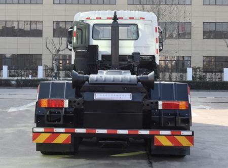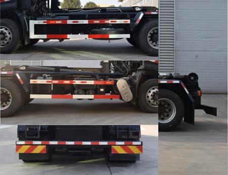 | 其他 | 仅选用底盘4350+1350轴距;选装XP20S型拉臂钩时,整备质量(kg):10900,驾驶室准乘人数(人):2,3,额定载质量(kg)分别为:13970,13905;选装XP22S,T20_PI,20-53-S,YHLLB-20型拉臂钩时,整备质量(kg):11400,驾驶室准乘人数(人):2,3,额定载质量(kg)分别为:13470,13405;选装XP22Z型拉臂钩时,整备质量(kg):11850,驾驶室准乘人数(人):2,3,额定载质量(kg)分别为:13020,12955;安装具有卫星定位功能的行驶记录仪;安装ABS,ABS型号/生产厂家:3631010-C2000/东科克诺尔商用车制动系统(十堰)有限公司,ABS 8/东科克诺尔商用车制动系统(十堰)有限公司,4460046450/威伯科汽车控制系统(中国)有限公司;选用D6.7NS6B290,DDi75E350-60发动机,对应油耗值(L/100km)分别为31.3,31.7;侧面及后下部防护装置材料为Q235,连接方式为螺栓连接;后下部防护装置截面尺寸(高×宽)(mm)为:120×80,离地高度(mm)为:480;该车主要通过液压拉臂装置将装载有生活垃圾的厢体自行装厢、转运、卸料和卸厢的功能. | ||