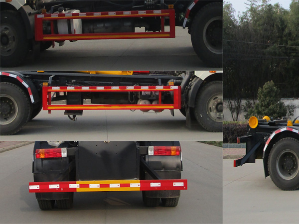 | 其他 | 该车主要用于实现压缩垃圾站的压缩块状垃圾的对接装载和转运卸料功能;主要装置为该车专用装置为勾臂,用于垃圾收集清运.侧、后防护材质均为Q235,连接方式:左右侧面防护采用螺栓加焊接连接,后部防护采用焊接连接,后部防护装置断面尺寸(宽×高)60×140(mm),后部防护离地高度:460mm.仅采用4500,4700,5000mm轴距;整车外形长/轴距对应关系为(mm):7830/5000,7530/4700,7330/4500.随底盘选装驾驶室.发动机与油耗值对应关系为(L/100Km):CA4DK1-22E6/25.6,CA4DK1-18E6/25.6,CA6DH1-24E6/26.92,CA6DH1-22E6/26.92;该车安装具有卫星定位功能的行驶记录仪.ABS系统生产厂家:长春瑞立科密汽车电子有限公司,型号:CM4XL.装备限速装置,限速89km/h. | ||