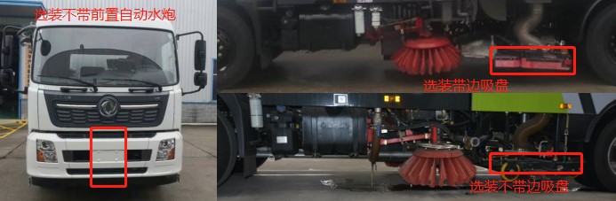 | 其他 | 该车仅选用5000mm底盘轴距;该车专用装置主要由吸盘和扫刷组成,用于路面洗扫作业.侧防护由专用装置吸盘、扫刷、油箱代替;后防护装置材料为Q235,螺栓连接,截面尺寸为:120×60(mm),离地高度为:435(mm); 安装具有卫星定位功能的行驶记录仪.ABS型号/生产厂家:3631010-C2000/东科克诺尔商用车制动系统(十堰)有限公司,ABS 8/东科克诺尔商用车制动系统(十堰)有限公司, 4460046450/威伯科汽车控制系统(中国)有限公司,J ABS/焦作博瑞克控制技术有限公司;选装限速装置;限速装置限速(km/h):89;随底盘选装高度不同的驾驶室;选装前雾灯;选装驾驶室顶部装饰灯;选装驾驶室前面罩;选装前保险杠及前部灯具,选装前下视镜,选装驾驶室卧铺侧窗装饰板.选装后视镜样式;驾驶室前脸扰流罩为选装件;选装后背式排气管;选装不带边吸盘;选装不带前置自动水炮,带前置自动水炮时前伸为660mm;标配带前置自动水炮时全车长-前后悬-前伸对应关系为9290-1430/2200-660(mm);选装不带前置自动水炮时全车长-前后悬对应关系为8630-1430/2200(mm)。该车型可选装ETC车载装置. | ||